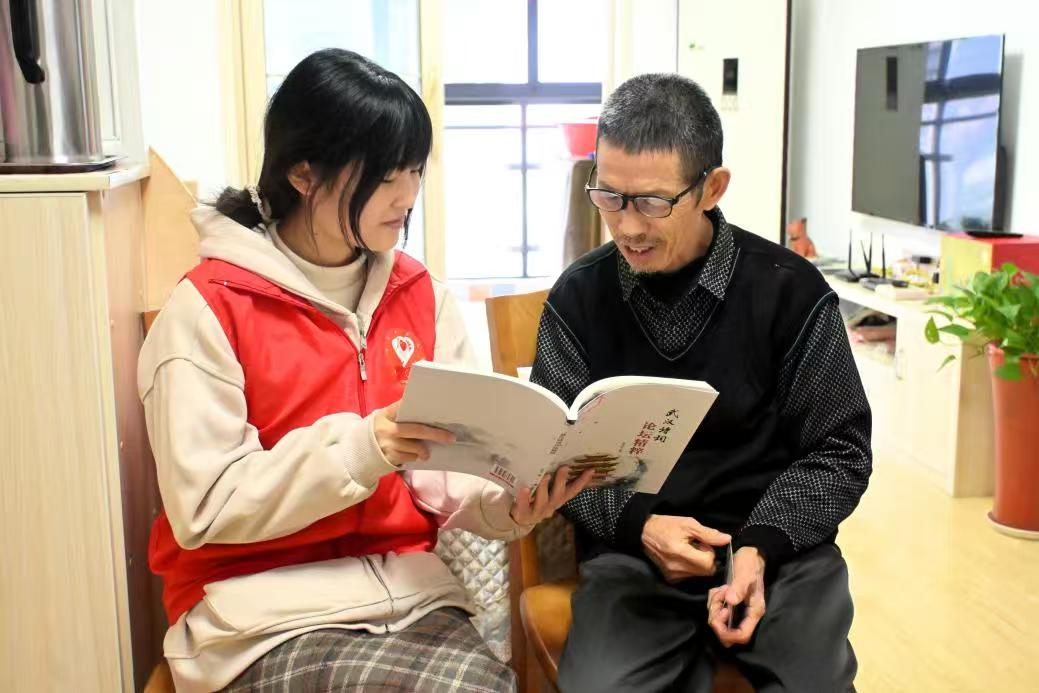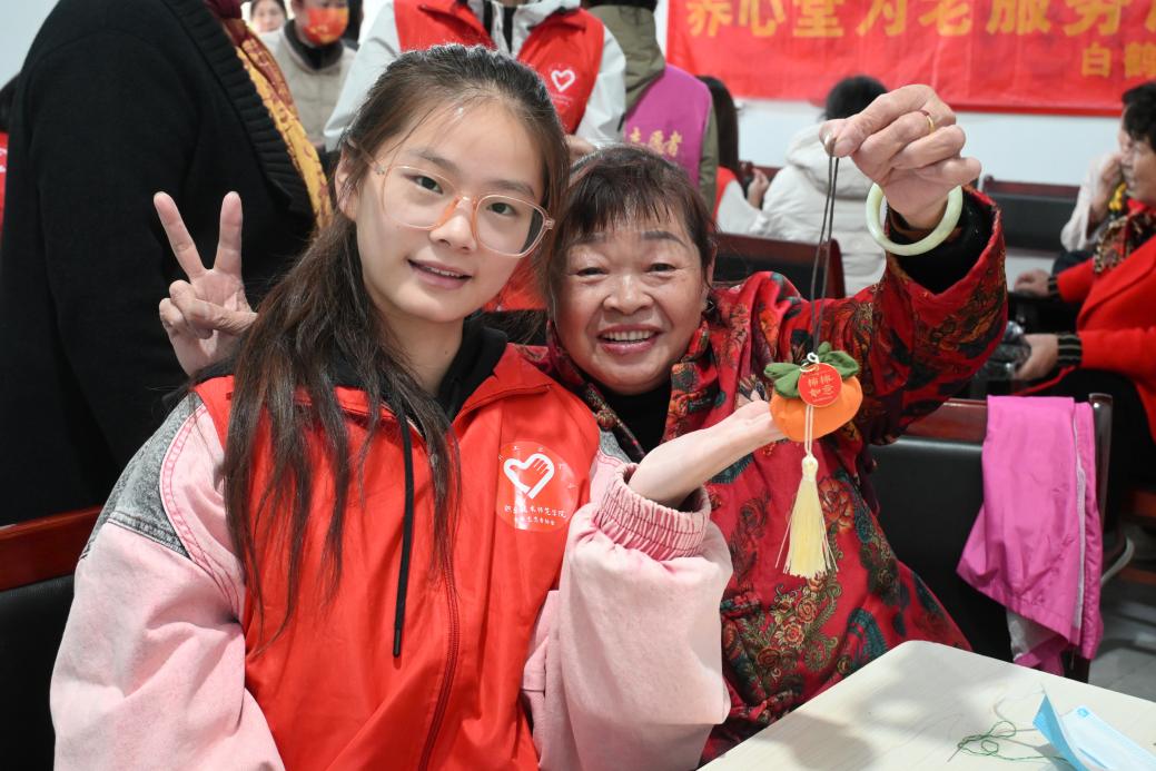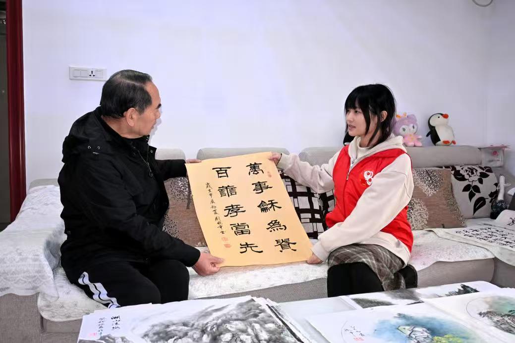 在给老人们传授新技能的同时,志愿者们也成了传统技艺的聆听者与记录者——书画达人刘老师展卷挥毫,“万事和为贵,百善孝为先,”十二字遒劲洒脱,引得同学们赞叹连连;诗词“发烧友”王老师即兴吟诵原创诗篇《看渔门拆迁原址还建并更名“九龙湾”所感》,让大家在平仄韵律中感受到城市的变迁。
