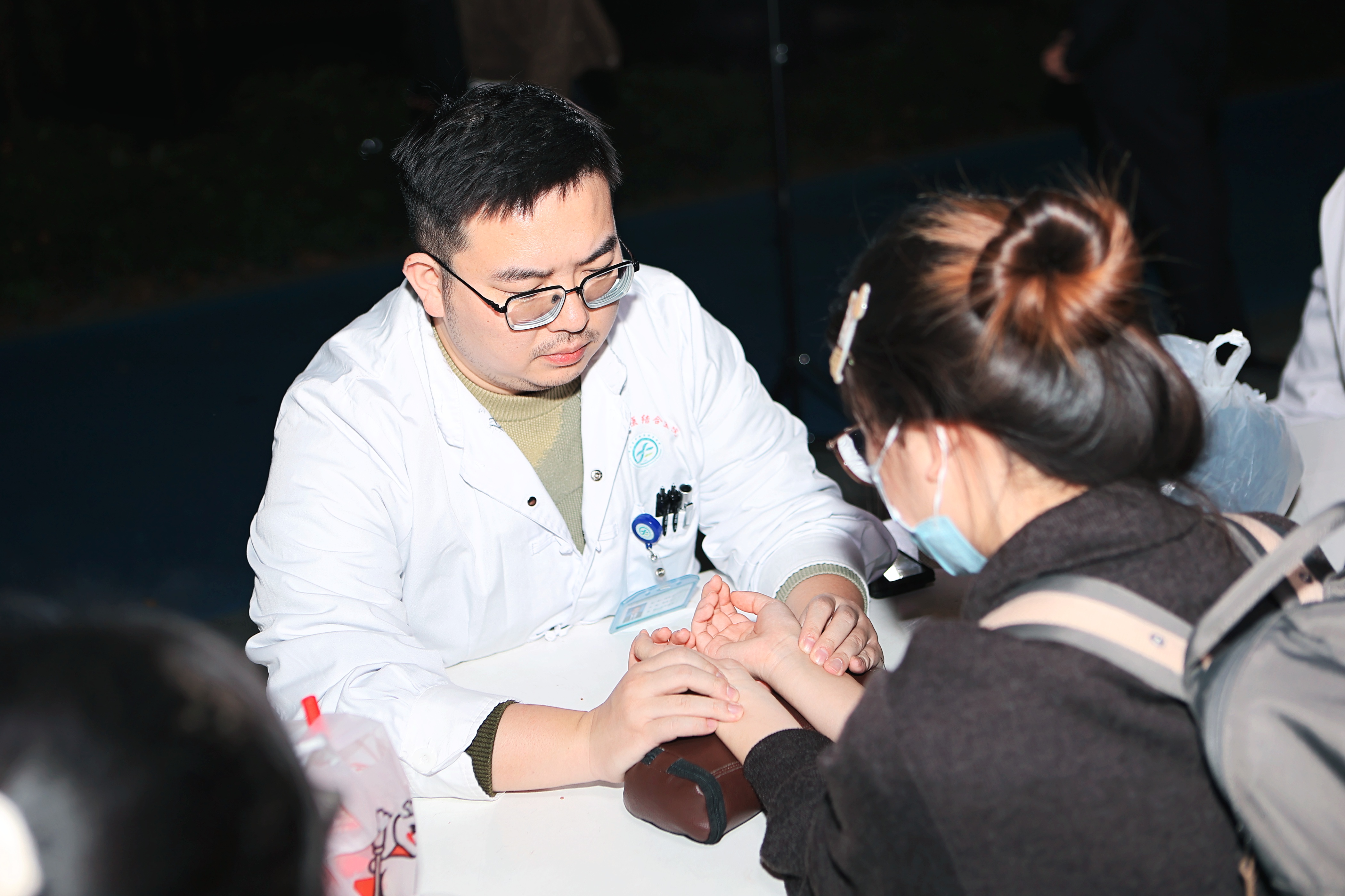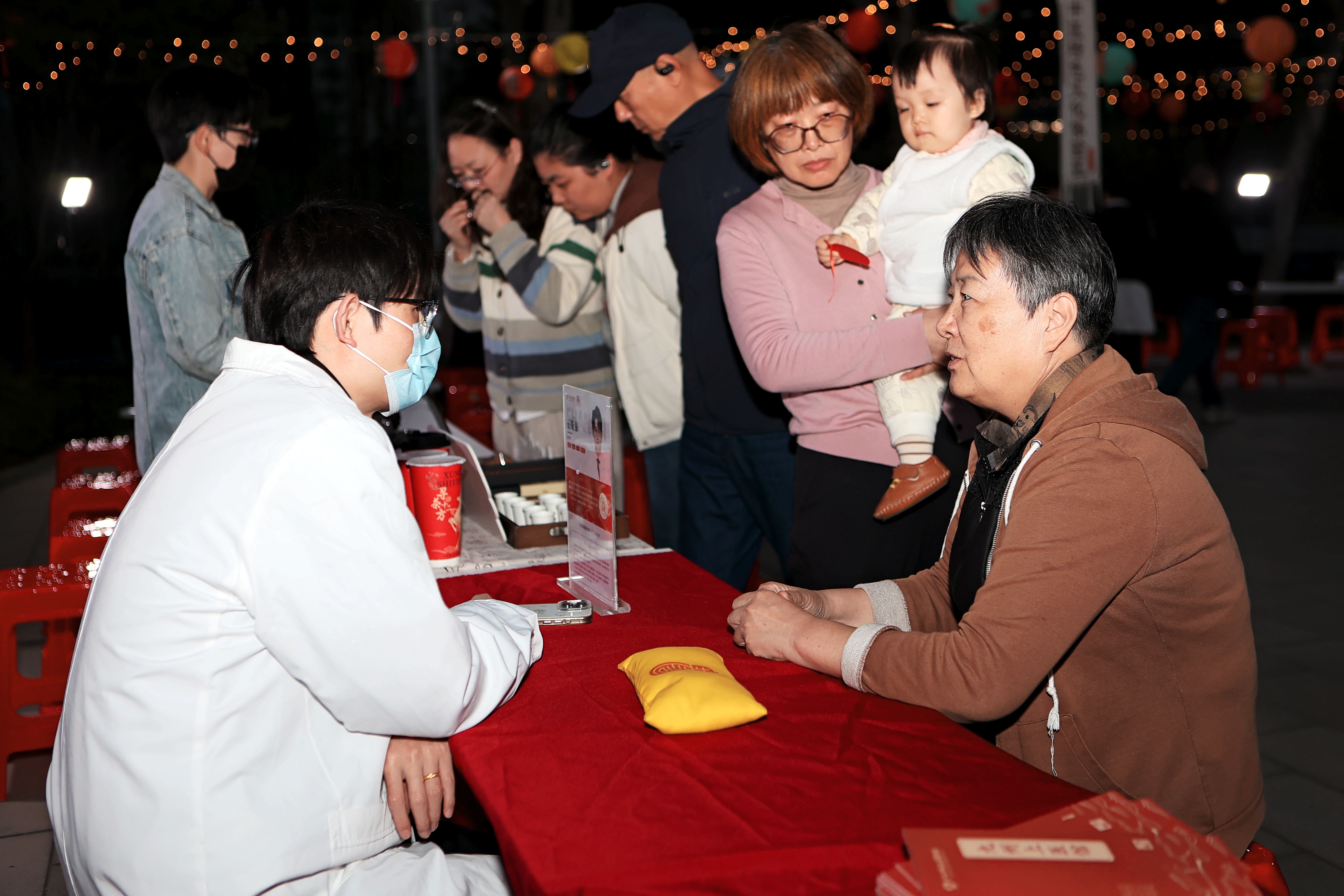 18时整,华灯初上,菱角湖广场就聚满了前来体验中医药文化的市民。在中医名医义诊区,中医特色门诊主任钟利平、康复科主任张阳普等20位专家组成的团队开展杏林暖心义诊及重阳敬老关怀活动,为市民提供脉诊、舌诊、体质辨识、调整建议,还为老年人免费测量血压、血糖。在中医药文化体验区,不少年轻人体验耳穴贴压、刮痧、火龙罐等中医适宜技术;年轻父母带着孩子,在医护人员指导下,巧手制香囊。在健康互动区,市民边品鉴中药茶饮,边欣赏特色文化展示。