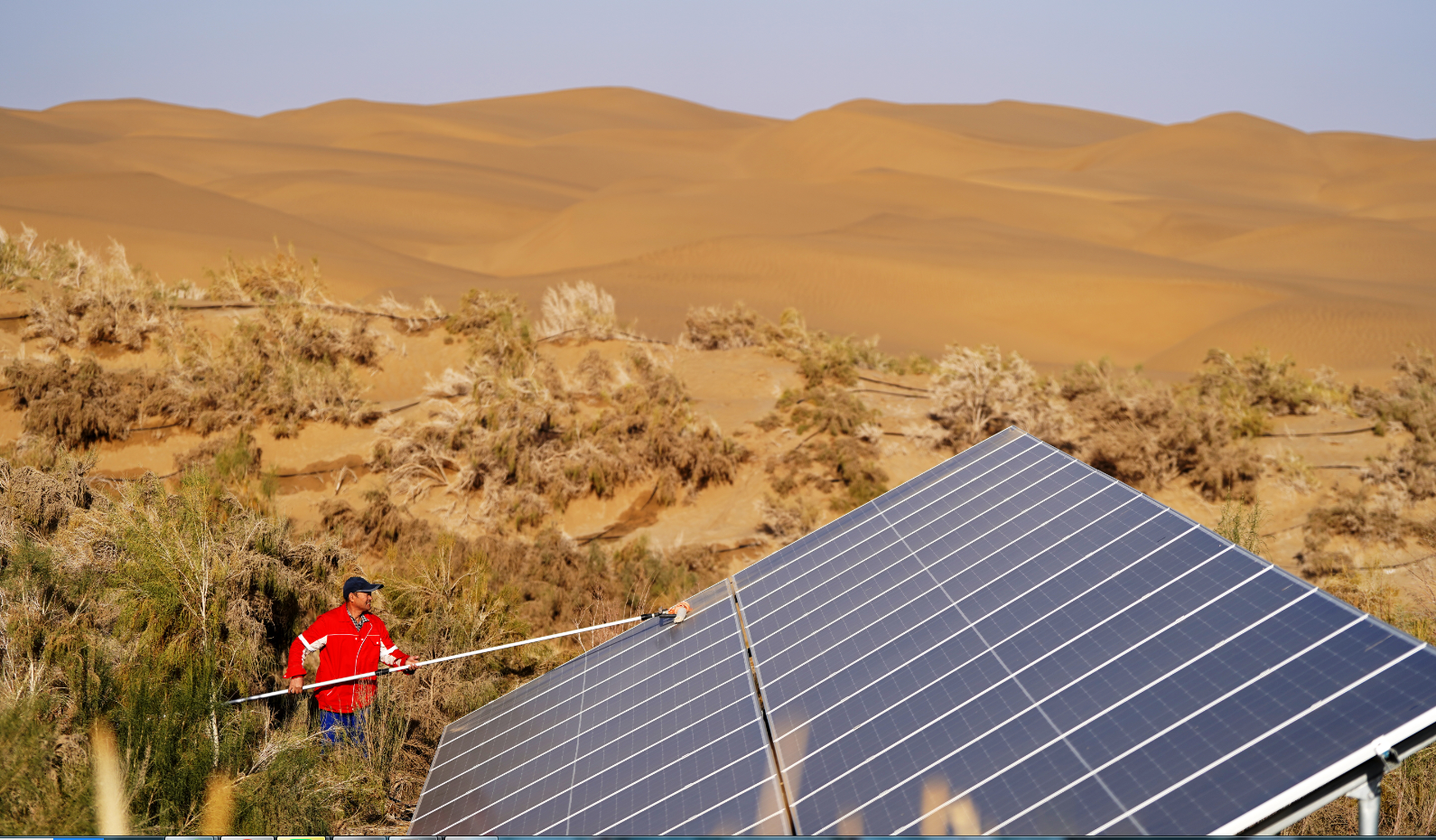 张师傅每天都要清扫光伏面板上的流沙。