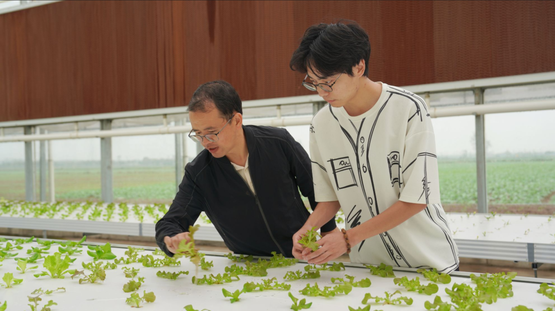 嘉鱼县潘家湾镇蔬菜科技馆,省农科院经济作物研究所副研究员刘志雄(左)与助理在观察蔬菜长势。