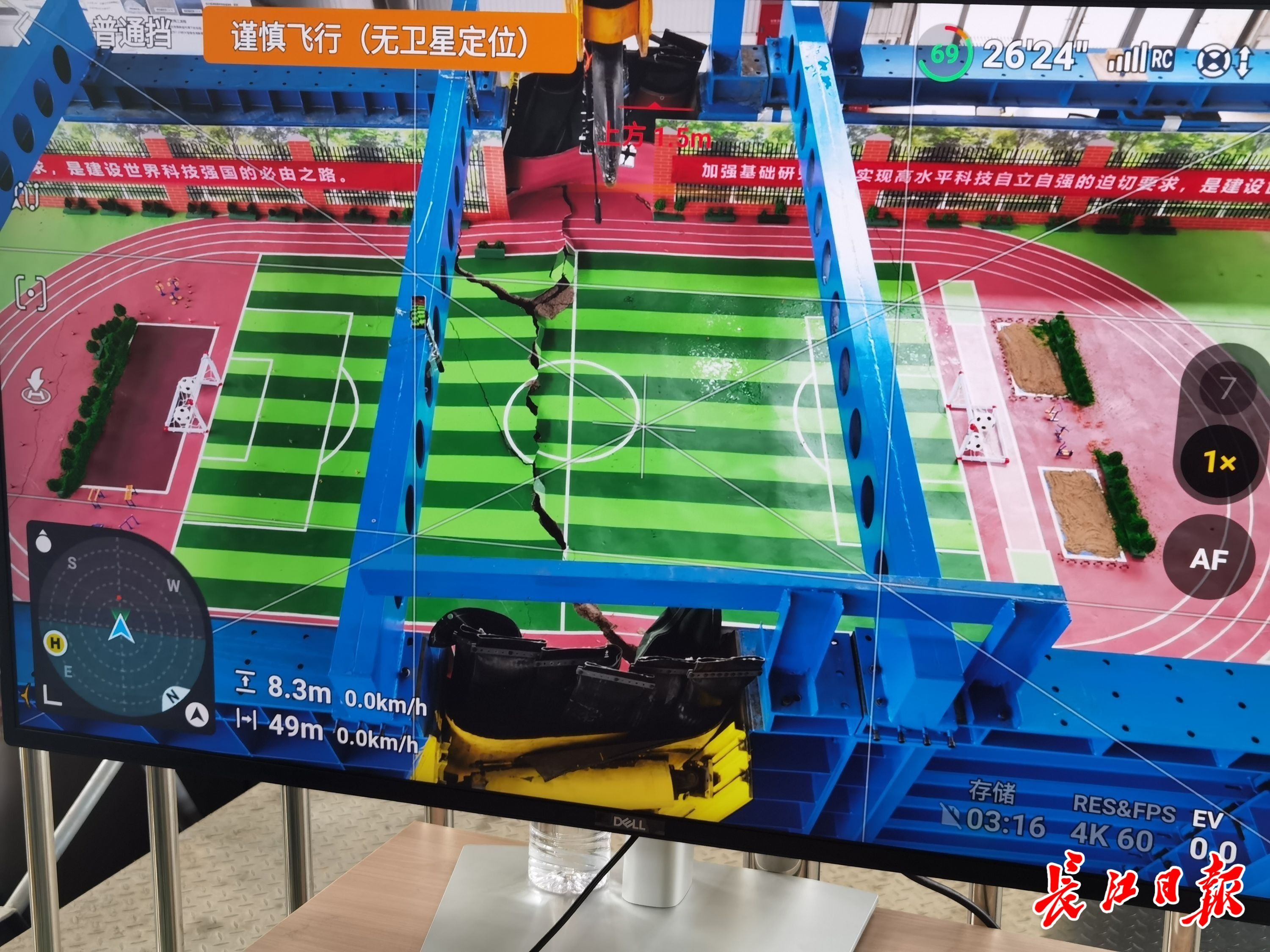 首次地震断层模拟实验中,监控显示70平方米足球场从中间断裂。记者杨佳峰 摄