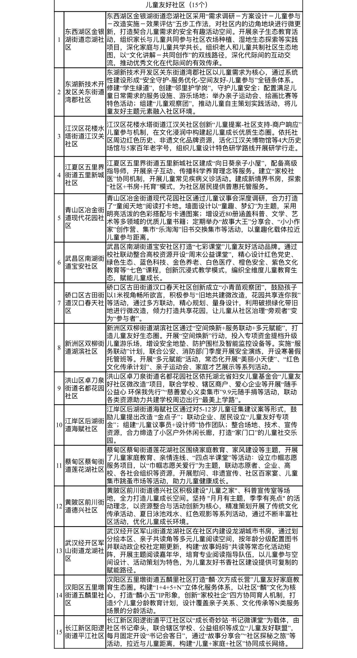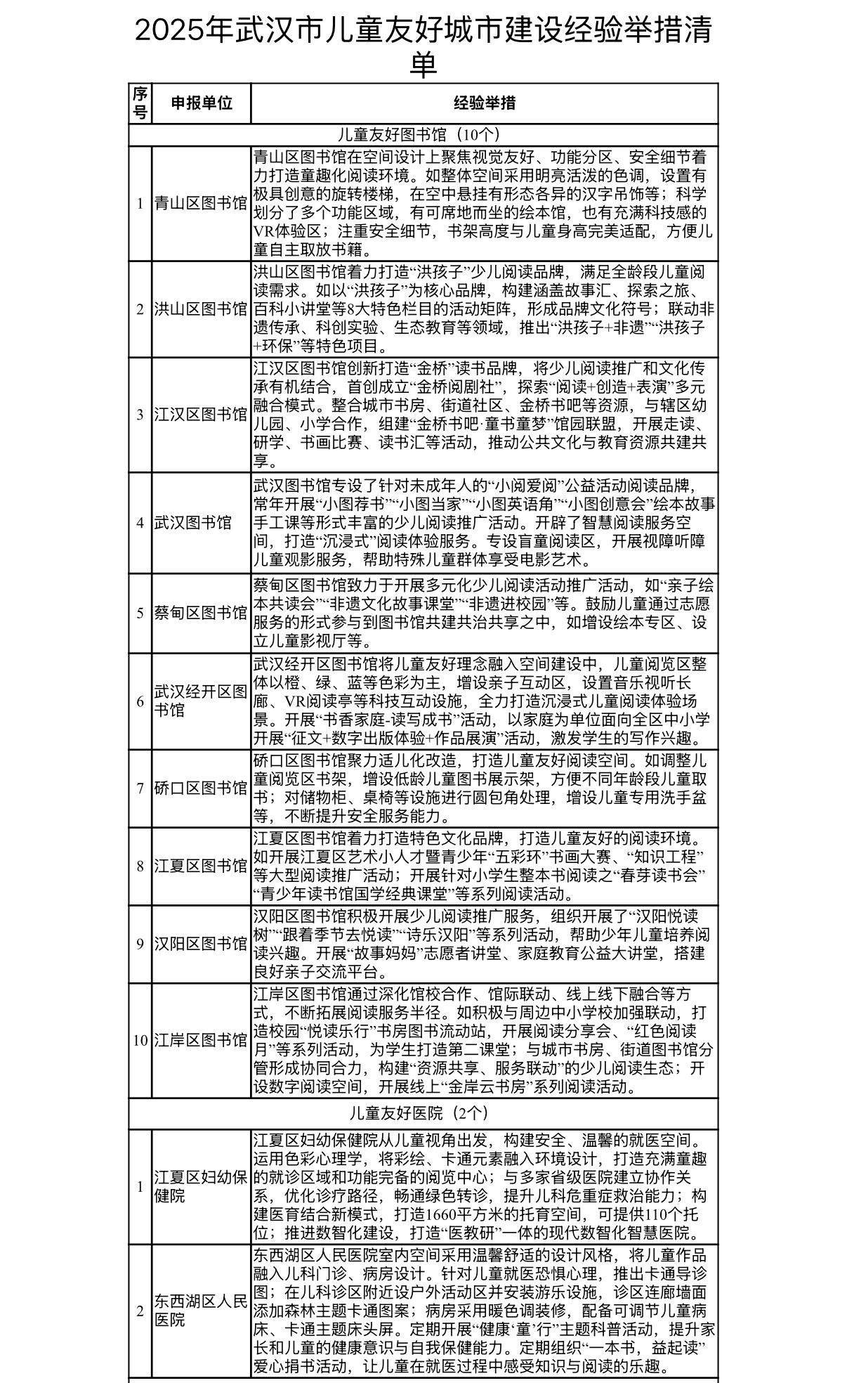 长江日报大武汉客户端11月17日讯 11月16日,在“敢作气候担当 点亮儿童未来”友好武汉 “童”样精彩2025世界儿童日主题活动中,武汉市发布年度儿童友好城市建设经验举措。江汉区花楼水塔街道江汉关社区等15个儿童友好社区、青山区图书馆等10家儿童友好图书馆、江夏区妇幼保健院等2家儿童友好医院、远洋鲸奇儿童友好口袋公园等3家儿童友好公园以及武汉科技馆、武汉市福利院的经验举措成功入选。