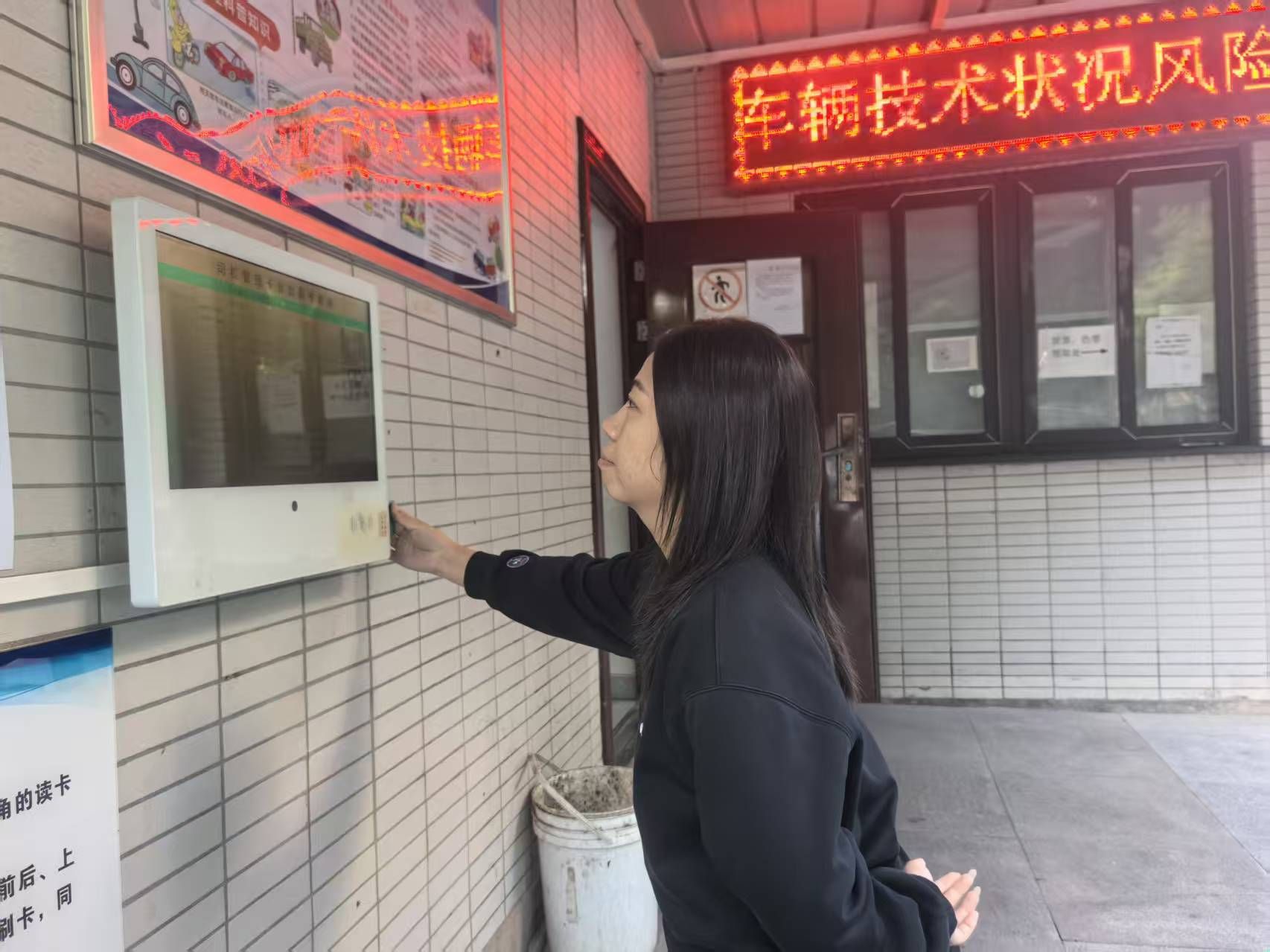 就在李师傅观看“岗前微课堂”的时间里,公司稽查管理部的张建兵和一名同事迅速对李师傅的车进行检查。“李师傅,请清理一下主驾门上的塑料袋。”张建兵一眼就见到车辆主驾门上过早吃完剩下的垃圾袋。“DAMS设备(后台监控)正常,无遮挡。双评议二维码完整!证照都在车上,标志标识都规范张贴。”张建兵探身在车内一番检查后,对正在后备厢检查清洁与否,灭火器配备是否完整的同事说。“收到,我这边后备厢也没问题。”说完,同事在携带的检查表格上一一画钩。前后不到十分钟,完成刷卡,且打了一杯热水的徐师傅回到了车上。“没问题啦李师傅,就是车子外观可以再干净一点。”张建兵说。“晓得,本来就准备今天收班后去洗车的。”李师傅爽快答应,开车离开了。