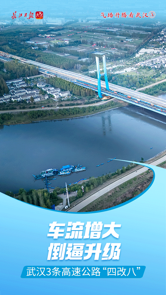 由“四”变“八”,武汉周边,京港澳、武黄、汉宜3条高速公路改扩建加速,崭新宽阔的道路在大地上延伸。在湖北、在武汉,高速公路建设正阔步迈向“八车道时代”。