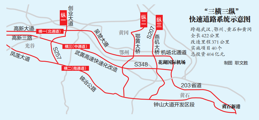“三横三纵”快速道路系统跨越武汉、鄂州、黄石和黄冈,全长422公里,改造里程371公里,实施项目40个,总投资404亿元,主要连通武汉光谷、鄂州花湖国际机场、黄石新港等重要枢纽,将使武汉都市圈东部地区联系更加紧密。