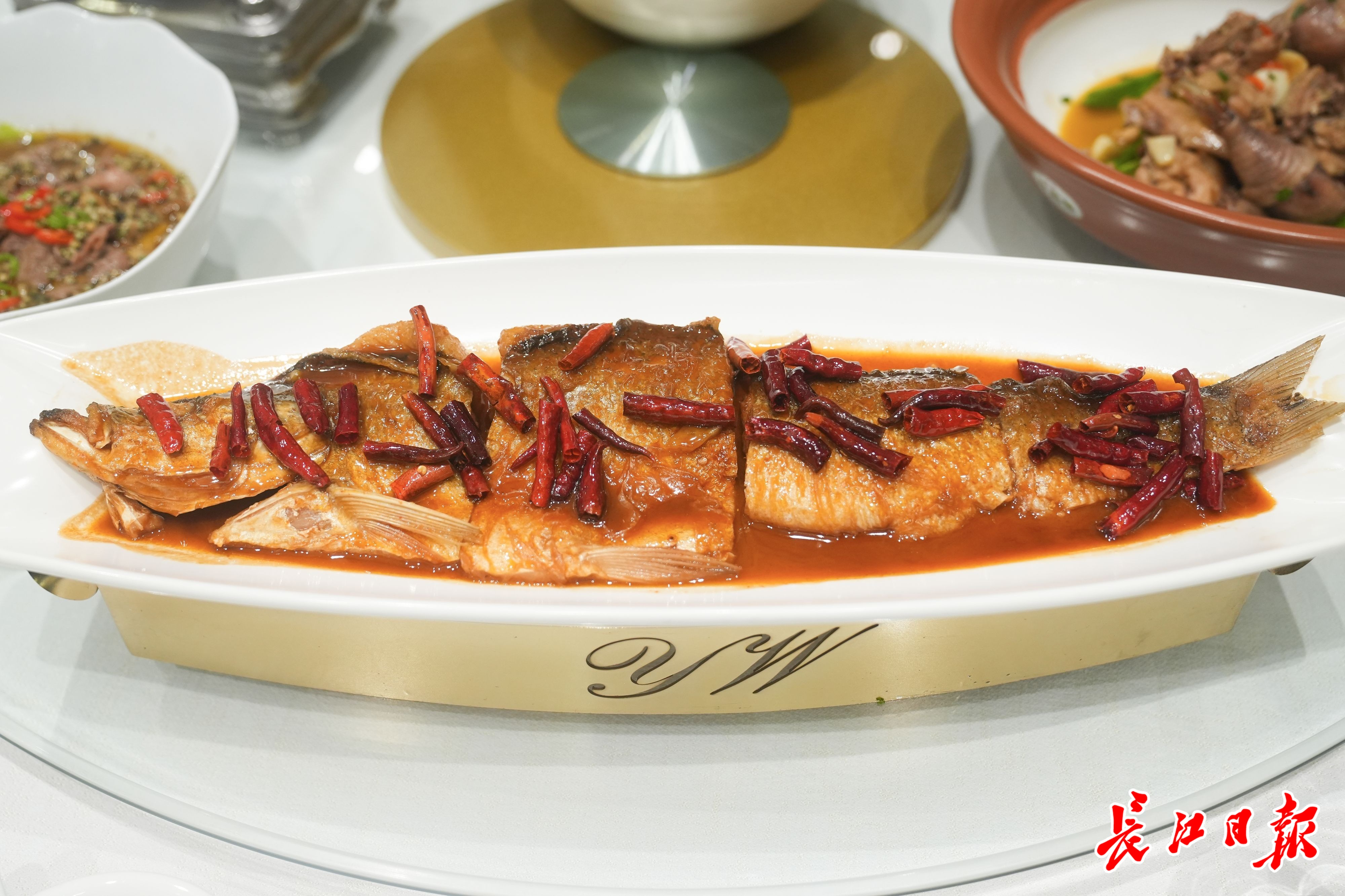 不一会,13道地道咸宁菜上桌,服务员现场介绍了其中代表性的3道菜。首先是赤壁关刀鱼,烧得色泽金黄。服务员介绍,关刀鱼是产自长江水系的淡水鱼,肉质鲜美,口感细腻,加上红辣椒及香味,相当有特色。第二道菜是奶白菜炖赤壁鱼糕,食材来自咸宁赤壁市,是当地特产,在咸宁几乎家喻户晓。第三道菜是高桥萝卜烧肉,常说冬吃萝卜夏吃姜,这道菜里的萝卜是咸宁滋补类的产品,配上猪血,口味鲜美。