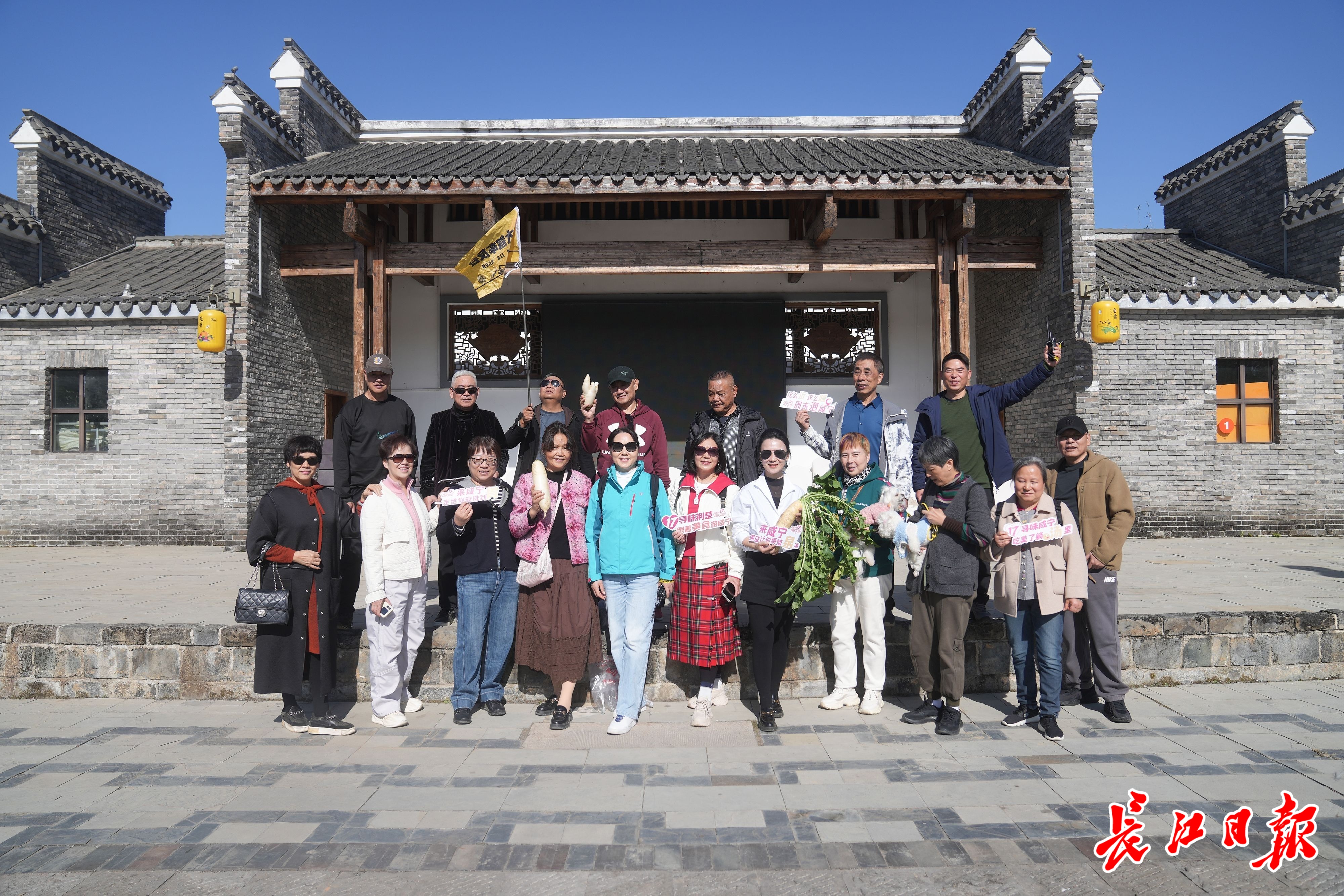 在萝卜公社文化广场戏台前,车友列队拍大合影。“知音湖北,超级文旅日;这个冬天,就泡在咸宁!”大家齐声喊出了此行活动主题。有车友手持白萝卜拍合影,萝卜上绿叶子舍不得摘掉;不少车友还买了景区里的萝卜干、干蘑菇、腐乳等咸宁特产。