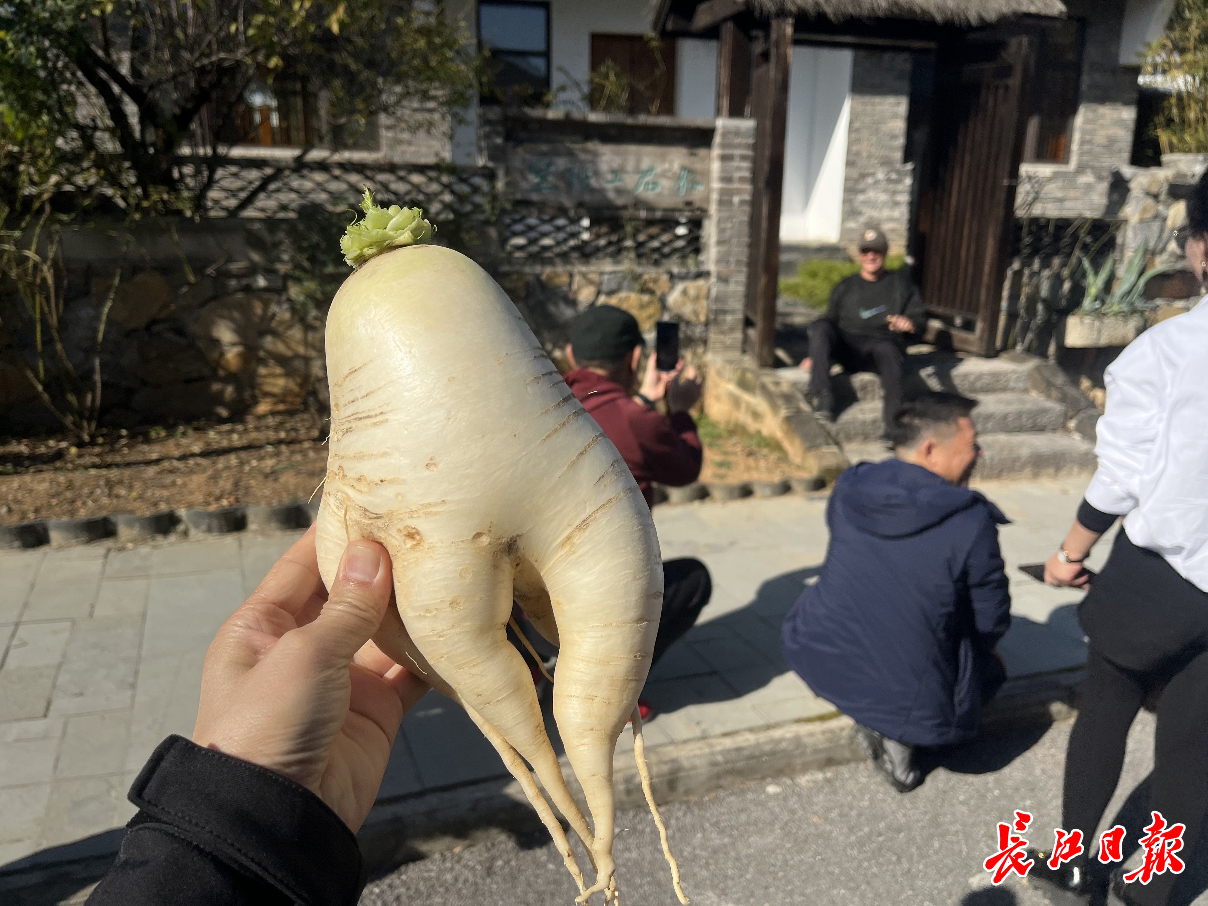 回到村湾区,车友们在一家石砌庭院的院门台阶上拍照打卡,几乎每人都拿着大白萝卜留影。手持“大驾车友会”黄色会旗的领队耿志明说,车友们难得有机会这么近距离接触乡村田园,大家难掩兴奋,自在随性,尽享了童趣。