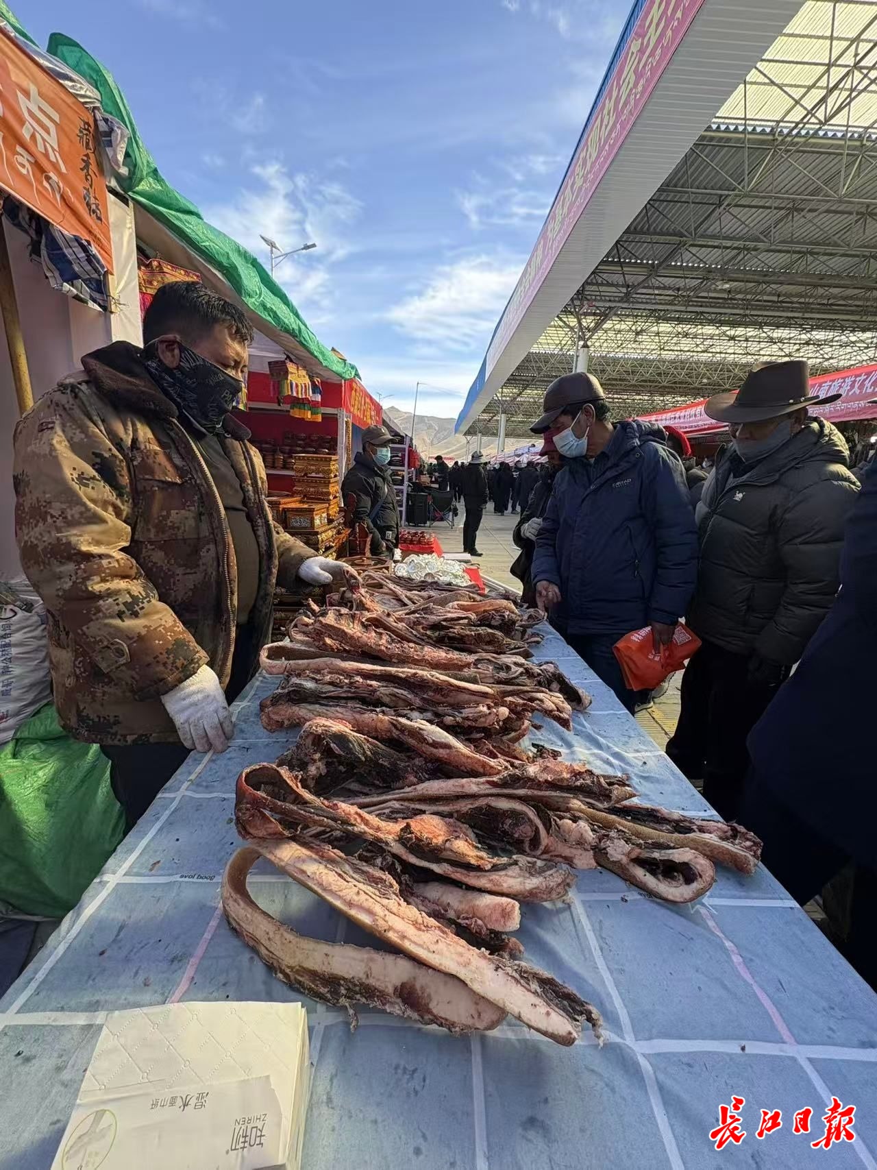 对于第一次逛物交会的外地人来说,现场着实会给你一点震撼。绵延百米的主干道两侧,悬挂的都是新鲜宰杀的牦牛、藏香猪等,如果你的眼睛只顾上东张西望,还会不小心踢到放在路中间的牦牛头。同行的乃东区融媒体中心记者说,牦牛的头可以吃,也会有人买牦牛的角,做成装饰物。
