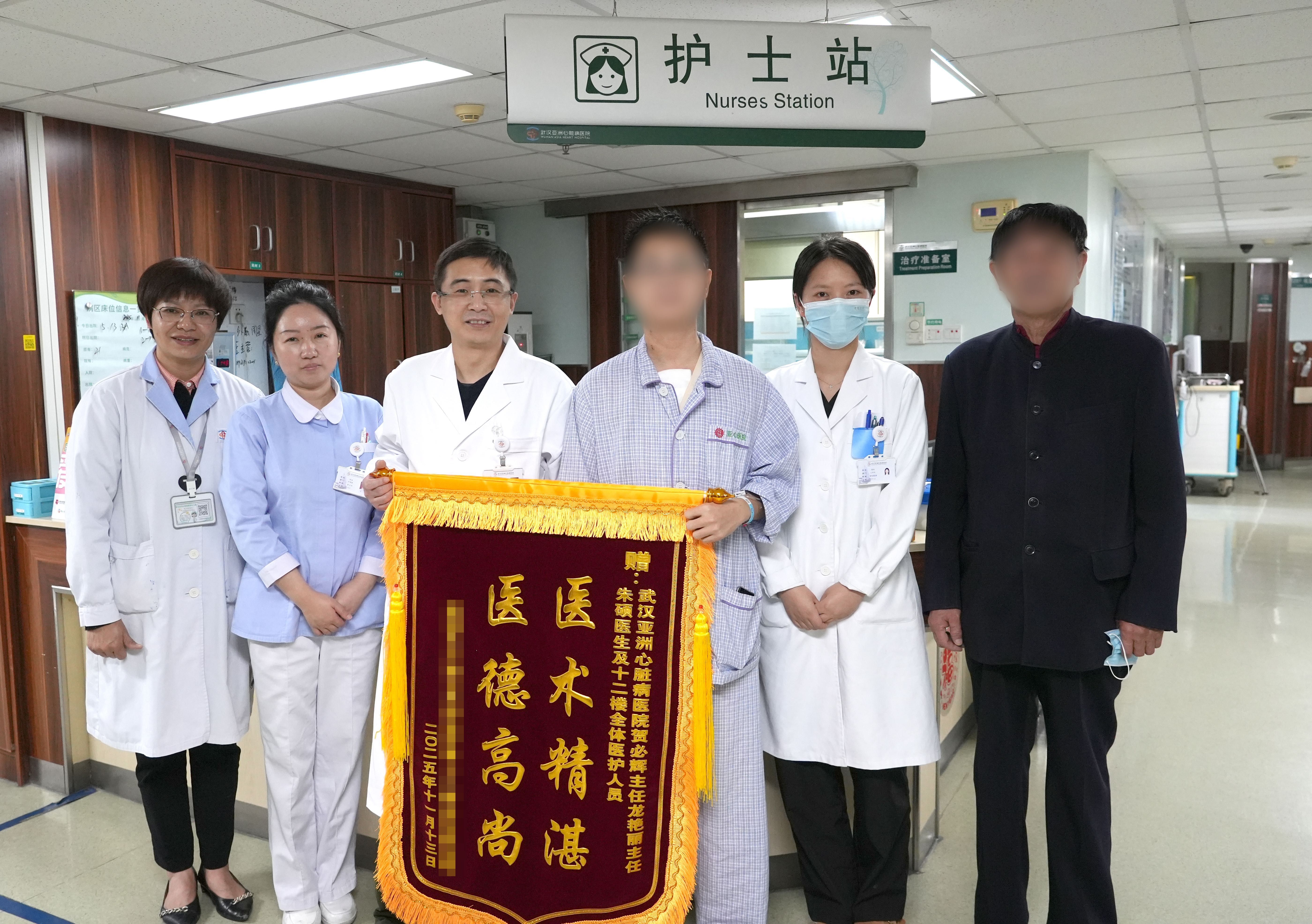 父子俩送锦旗致谢贺必辉主任(左三)。