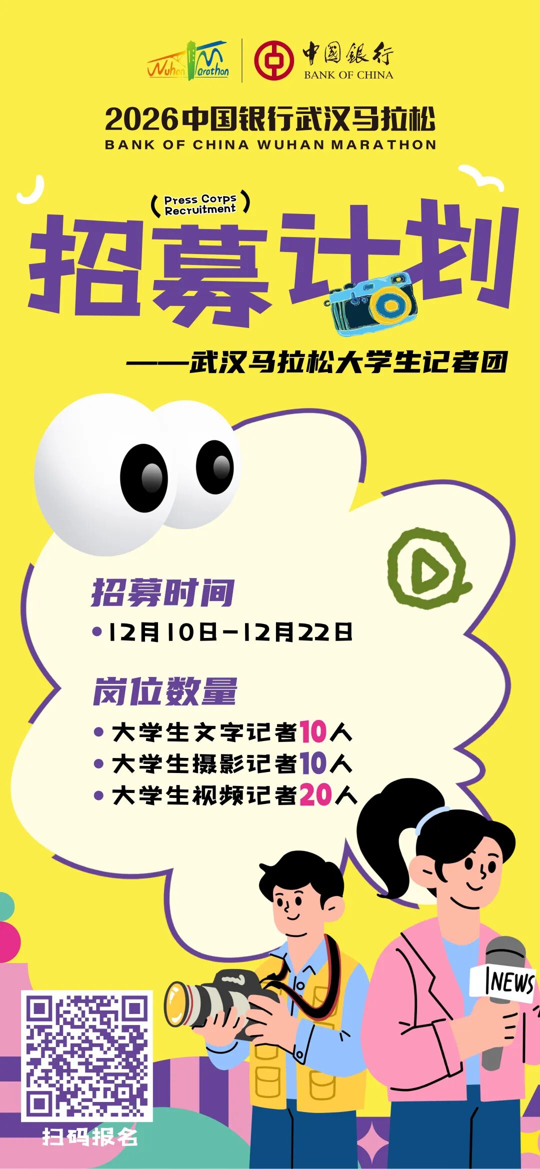 ● 2026武汉马拉松大学生记者团招募活动2025年12月10日启动,武汉所有高校在校大学生均可以报名参加。详见>>>
