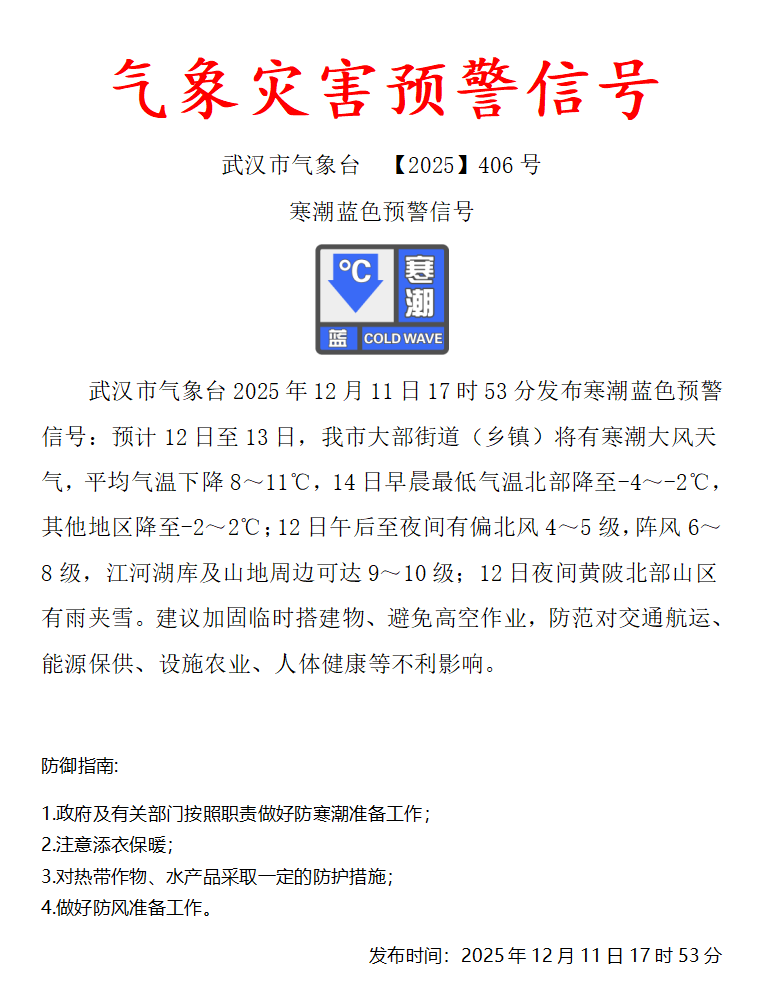 12月11日17时53分,武汉市气象台发布寒潮蓝色预警信号:预计12日至13日,我市大部街道(乡镇)将有寒潮大风天气,平均气温下降8~11℃,14日早晨最低气温北部降至-4~-2℃,其他地区降至-2~2℃。