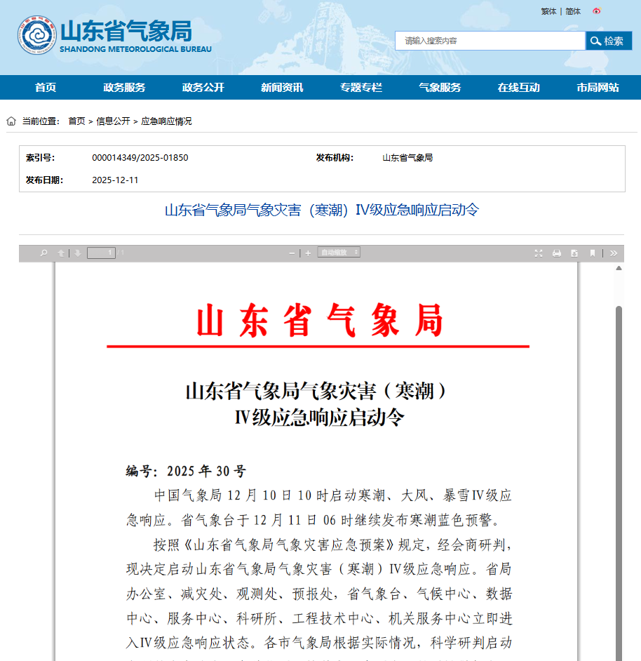 山东省气象局发布的气象灾害(寒潮)Ⅳ级应急响应启动令截图。