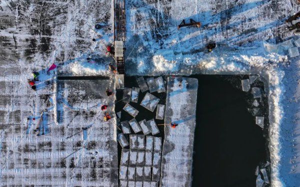 哈尔滨冰雪大世界设计研发部部长丛配玉向九派新闻介绍,这座冰雕黄鹤楼高27.4米,总用冰量达8600立方米,规模宏大。采冰队在松花江水面冰层厚度达标后,切割出数百公斤重的大型规整冰砖运至现场。
