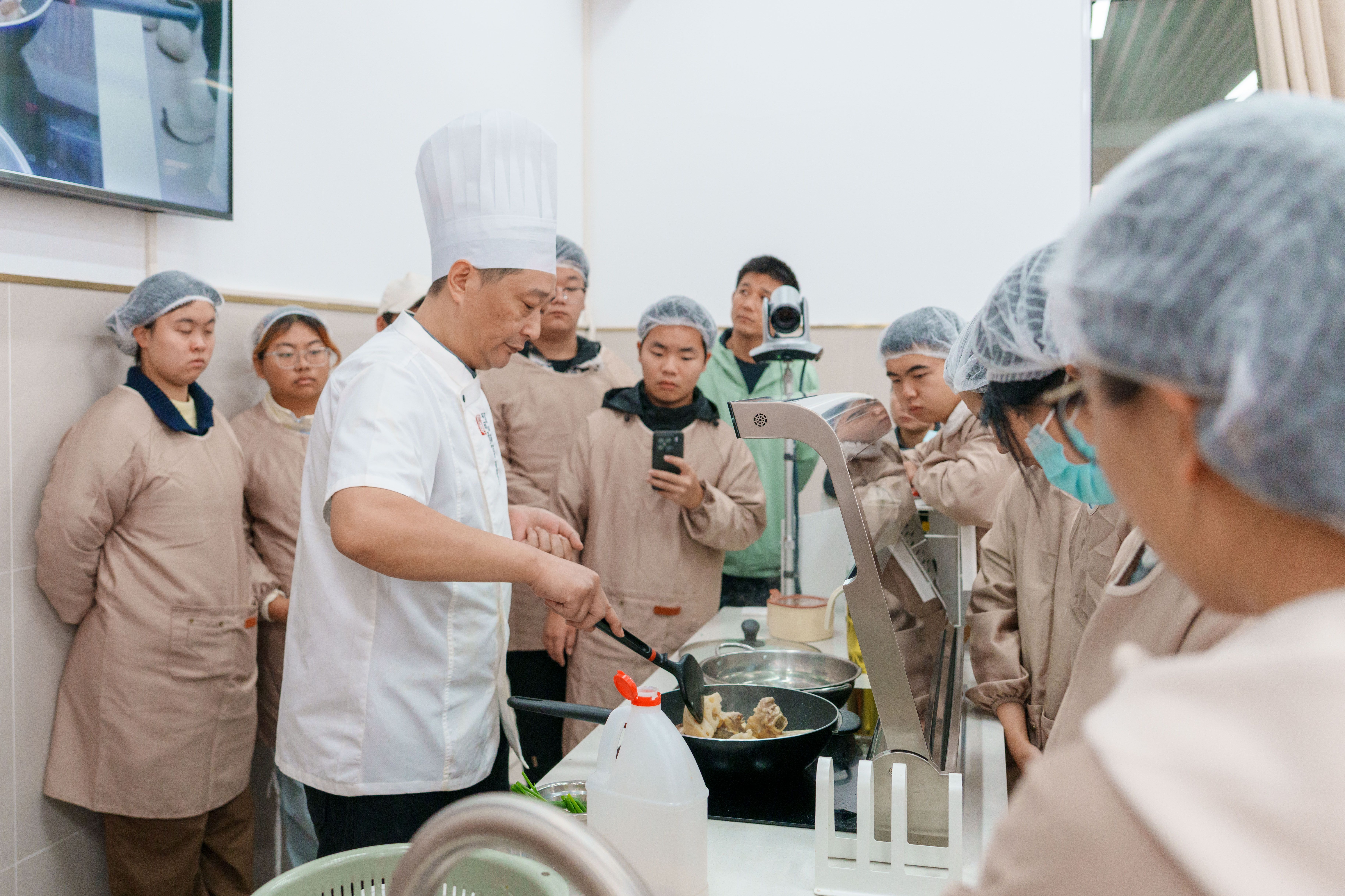 长江日报大武汉客户端12月23日讯 12月21日晚,华中农业大学荟园食堂里,红烧武昌鱼在锅中咕嘟作响,做菜的不是食堂师傅,而是身穿工作服的大学生们。