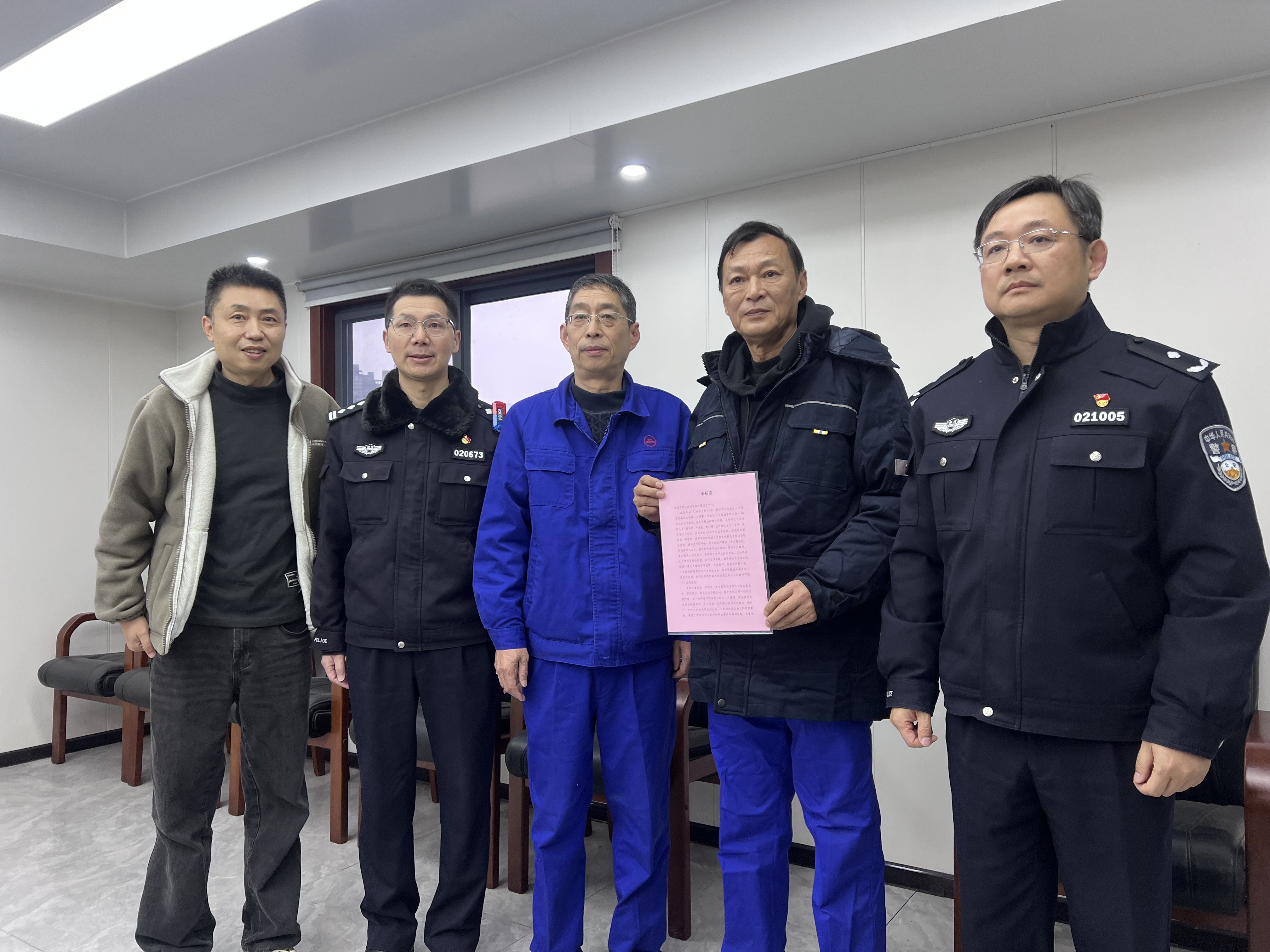12月23日,武汉市公安局水上分局王家巷派出所为清漂环卫工黄志强(左三)、童光武(右二)送去感谢信。通讯员供图