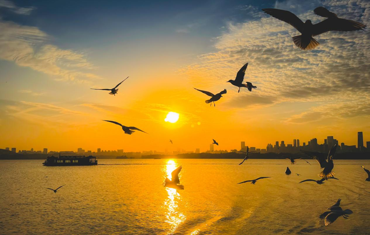 当东方天际晕染开橘粉色霞光,朝阳缓缓升起,成群红嘴鸥追着船舷盘旋飞舞,红喙白羽与橘色天光相映成趣。它们时而掠水激起层层涟漪,时而振翅冲向天际,与游客共赴这场破晓之约。
