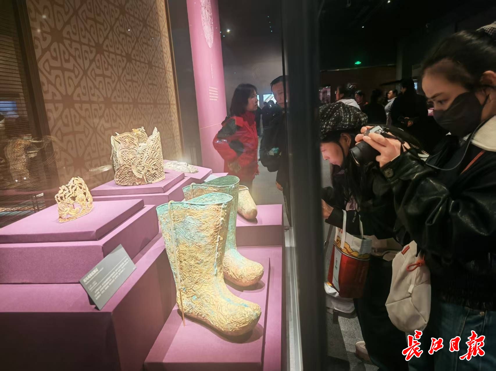 展出的辽(907–1125年)鎏金纹靴、云冠等。记者柯丽芬 摄