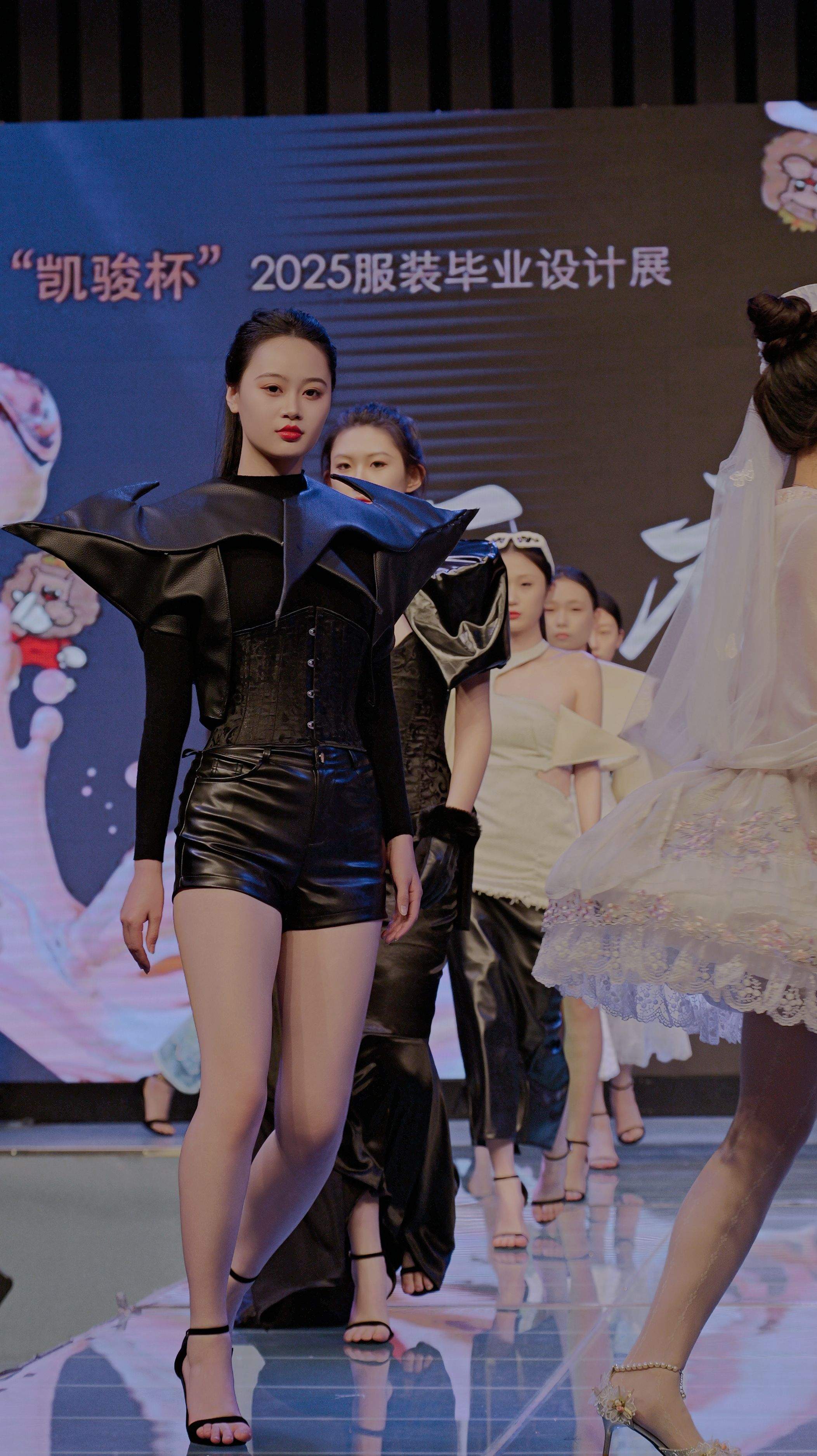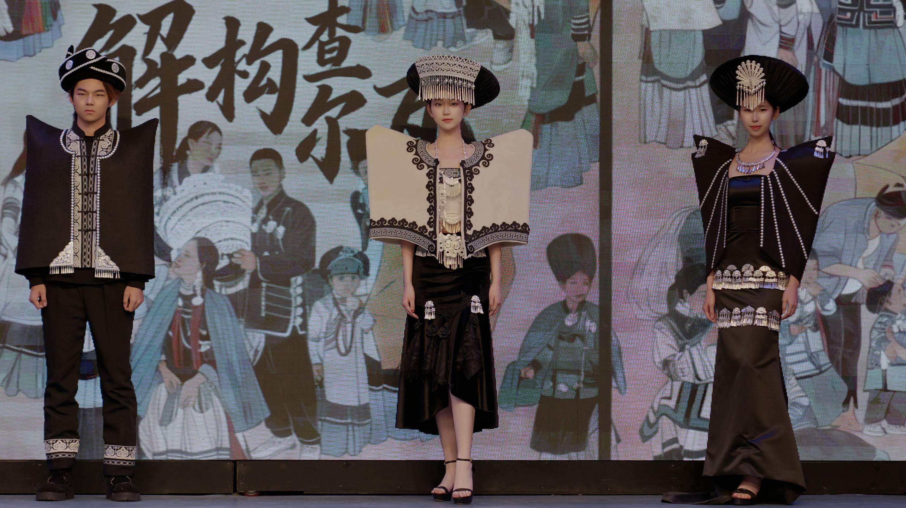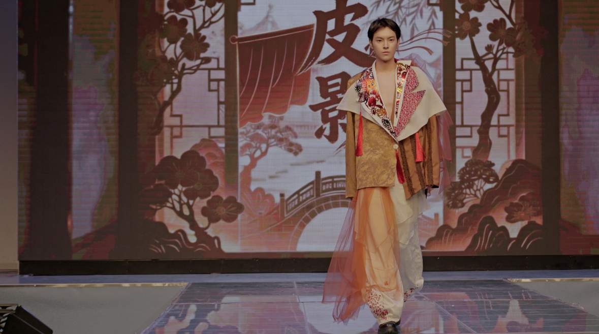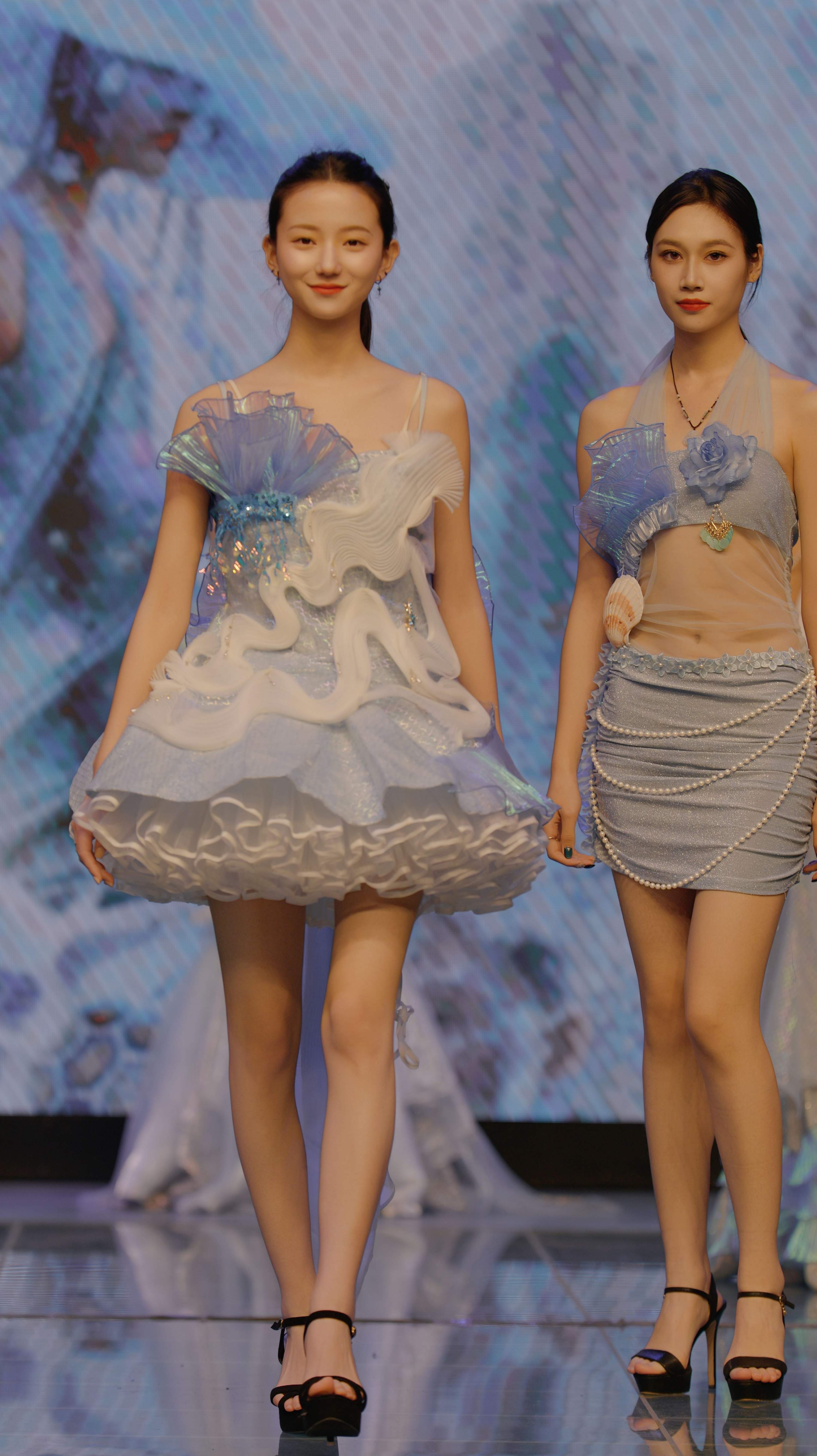 本次展演以“元启·融合”为主题,以创新为针、匠心为线,在织物与数据、过去与未来之间展开一场跨维度探索,重新思考服装作为连接自我与世界的媒介。展演共呈现《解构查尔瓦》《浪舞潮汐,听海》《墨韵革华,袂映新章》《皮影》《金叙》等十余个设计系列。作品围绕非遗传承、可持续时尚、国潮创新、数字融合、海洋保护等多元议题展开。