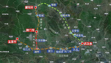 武宜段起自位于武汉市的汉口站,经天门市、荆门市,接入位于宜昌市的宜昌北站,线路全长314公里,设计时速350公里。全线共设汉口、汉川北、天门、京山南、钟祥南、荆门西、当阳西、宜昌北8座车站,其中汉口站、荆门西站为既有车站,其余为新建车站。