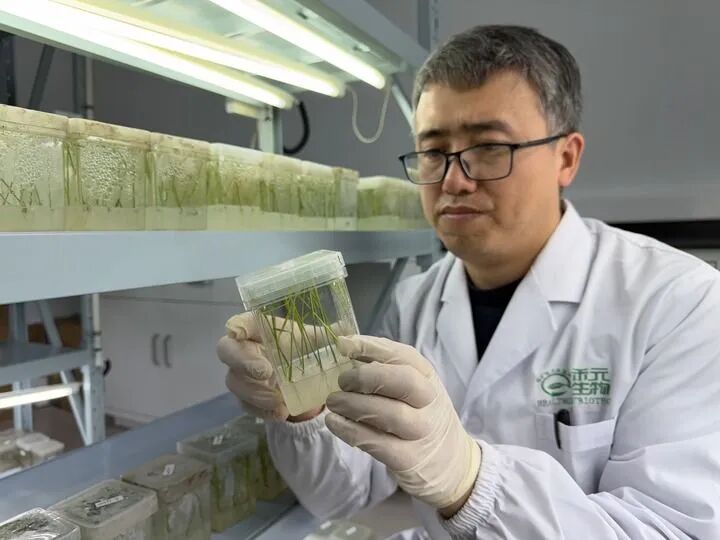12月12日,禾元生物研发项目高级总监董亮亮在实验观察稻苗状态。新华每日电讯 记者熊琦 摄