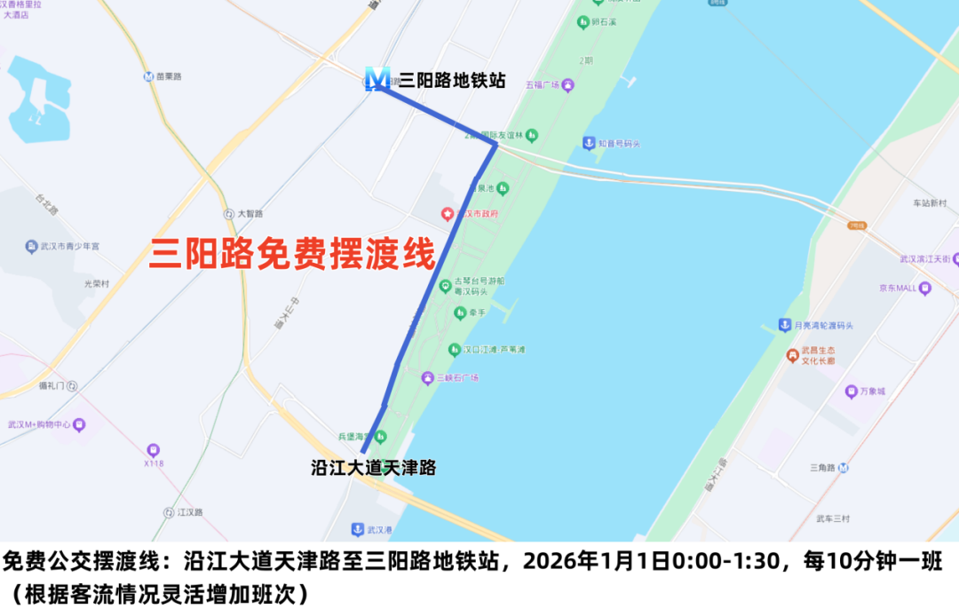 29日,武汉两江轮渡有限责任公司发布最新通告:为保障“星光映万家——2026璀璨长江·武汉跨年光影秀活动”期间轮渡渡运安全,2025年12月31日轮渡武中线(武汉关—中华路)、江滩线(晴川—武汉关—中华路)运营收班时间临时调整为18:00。2026年1月1日恢复原运营班次时间。