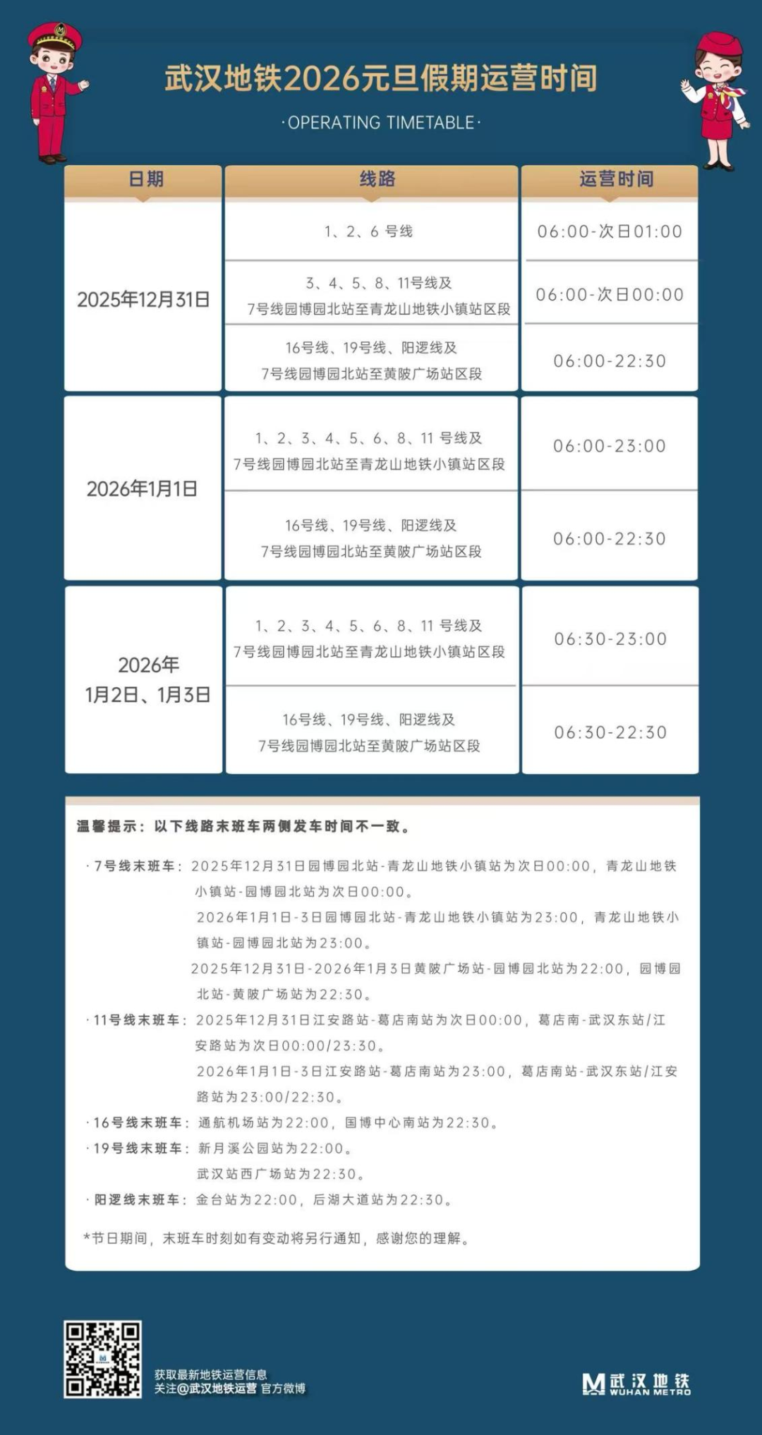 此外,元旦跨年期间,武汉轨道交通将延时运营。(详见>>>)