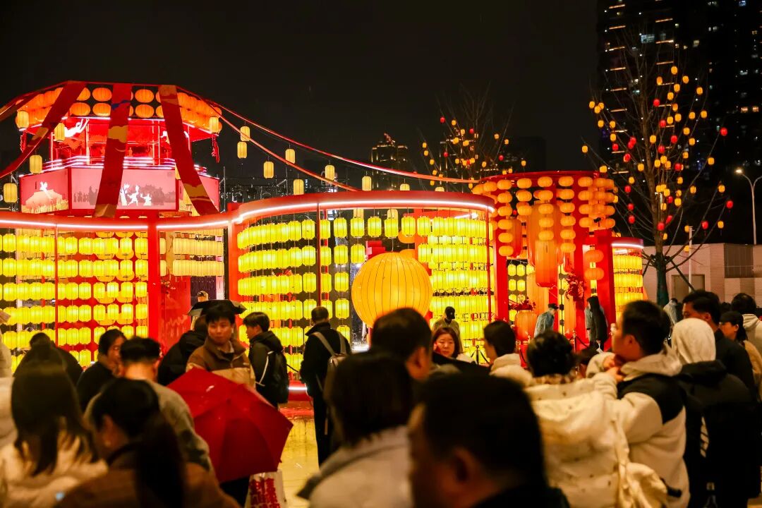 武汉江宸天街广场前,灯笼组成的打卡点吸引市民拍照。