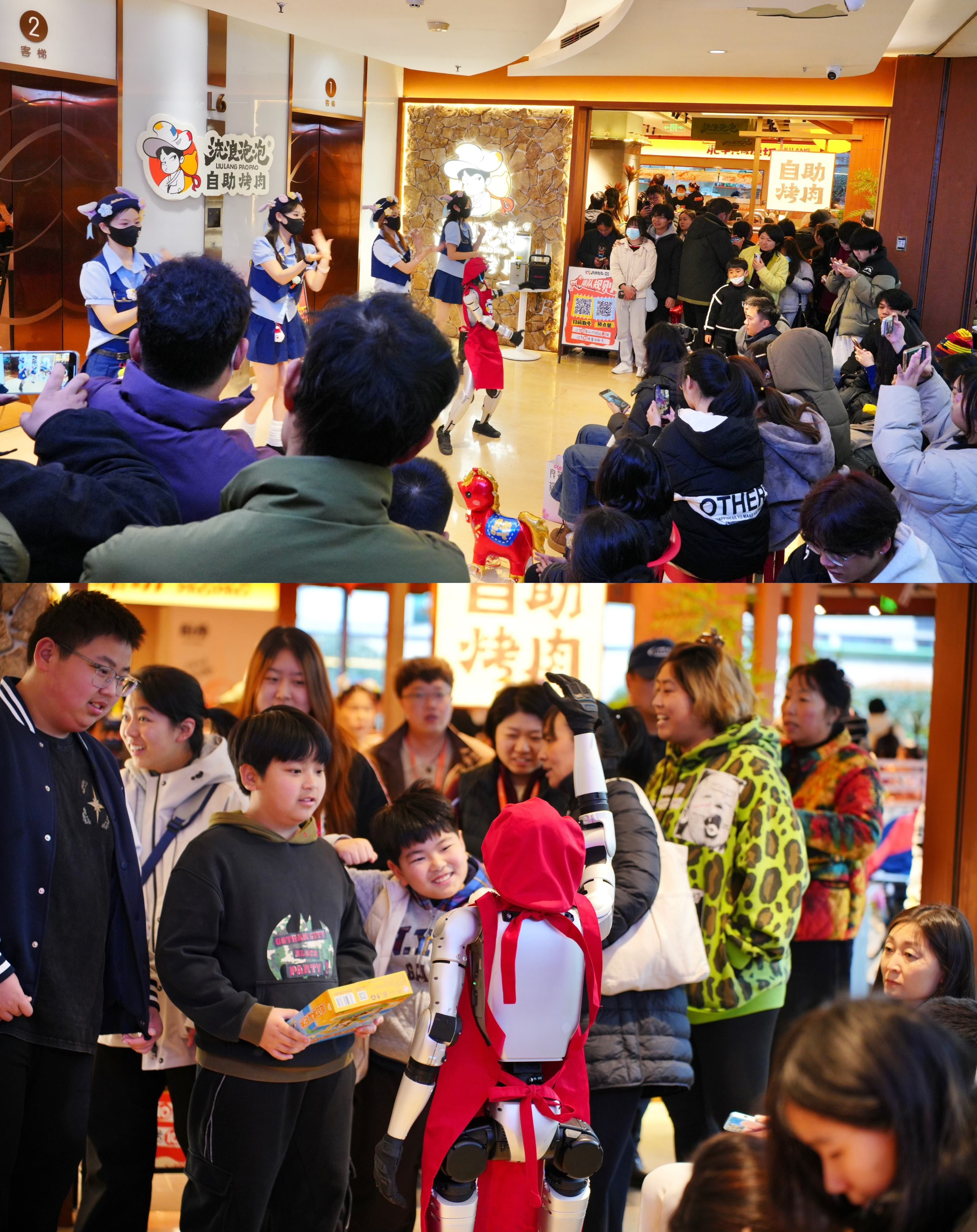 身着品牌视觉符号的人形机器人,不仅实现了迎宾引导、托盘传菜等基础服务,更完成了IP的本地化迭代——解锁杭州限定互动玩法,化身“白娘子”“许仙”开展主题巡游、演绎网红舞蹈,将科技IP与杭州传统文化符号深度绑定,现场吸引无数商圈消费者围观互动。