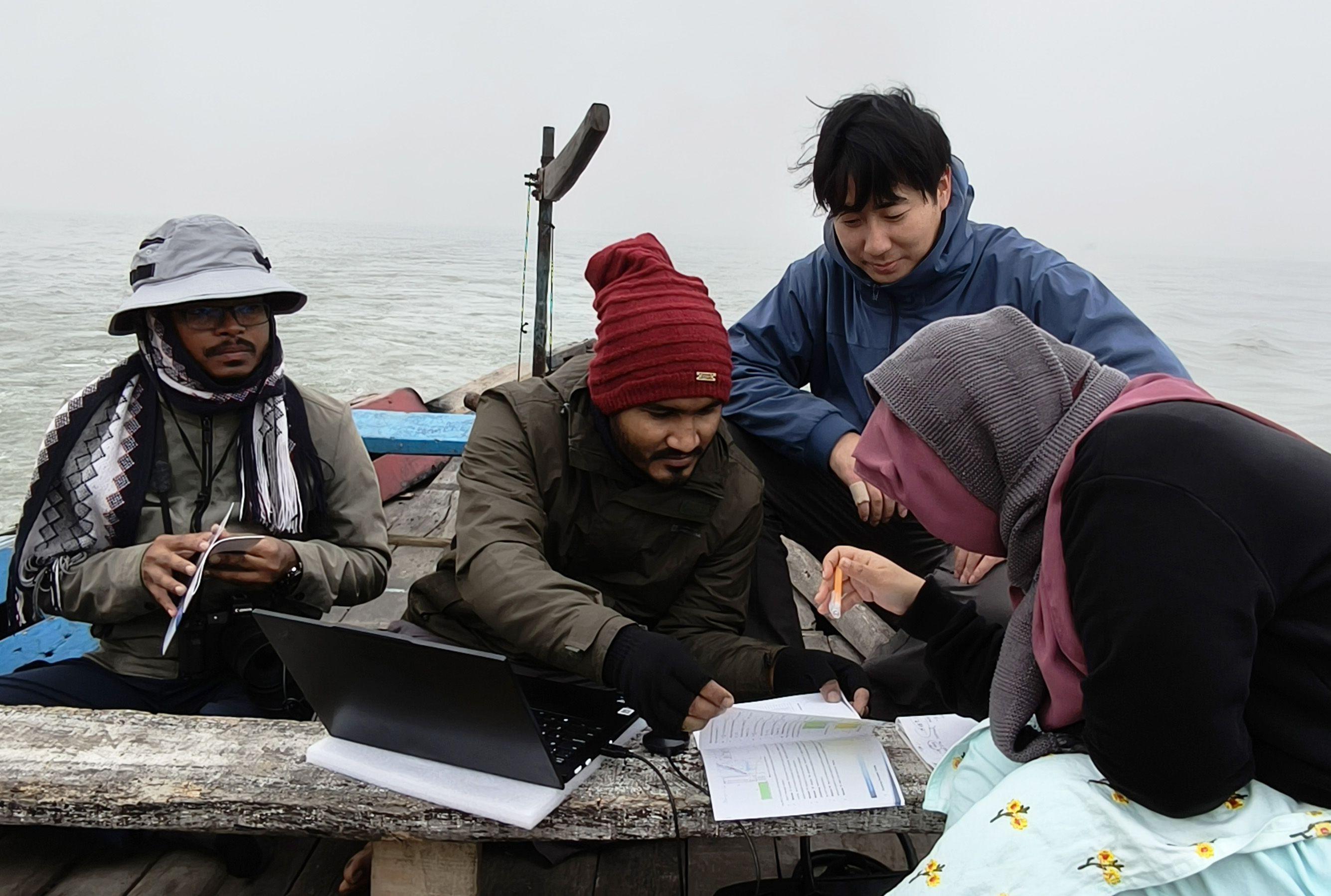 1月6日,孟加拉国贾木纳河和帕德玛河的交汇处,郝玉江与动物声学工程师陈宇维、博士研究生周昊杰,完成对濒危动物“恒河豚”为期一周的监测考察。