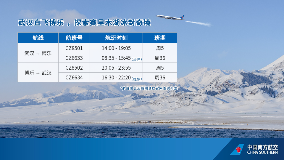 新增直飞航线,联通华中与全国冰雪胜地。冬航季,南航优化武汉出发至多个冰雪城市的航线布局。新疆方向,新开武汉直飞阿勒泰航线,每周2班;武汉至乌鲁木齐直飞航线每日3—4班,武汉至博乐航线每周2班。东北方向,优化武汉至哈尔滨、长春、沈阳、乌兰浩特等地航班频次,2月2日起,计划开通武汉至长白山直飞航班,每周一、三、五各一班。“冰雪航线网”有效串联起湖北与全国冬季旅游资源,为本地旅客提供更加丰富、便捷的出行选择。