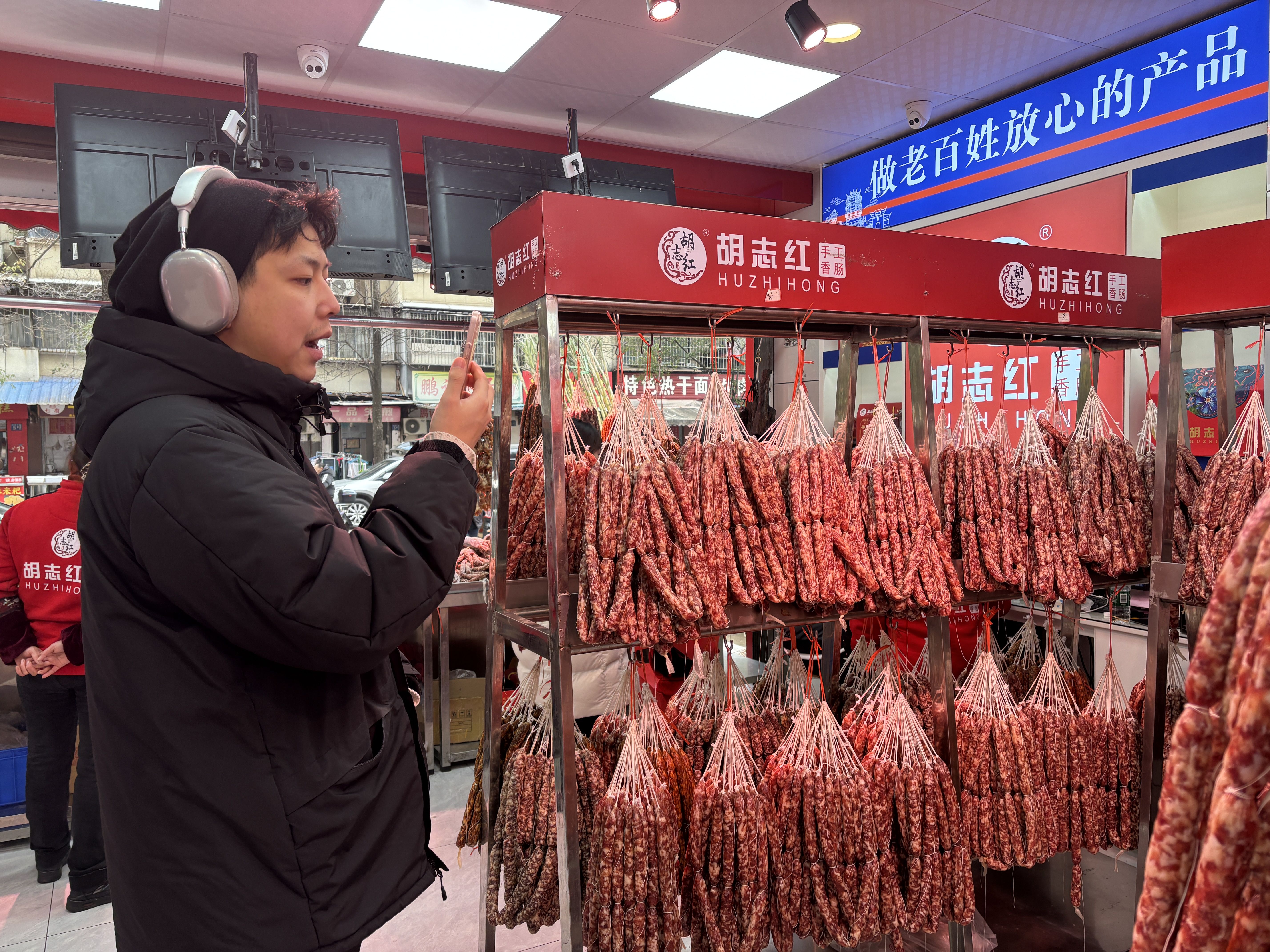 1月13日,长江日报记者在这家店看到,老板胡志红和店员们正忙着招呼顾客,2名主播则头戴耳机、对着手机屏幕直播带货。