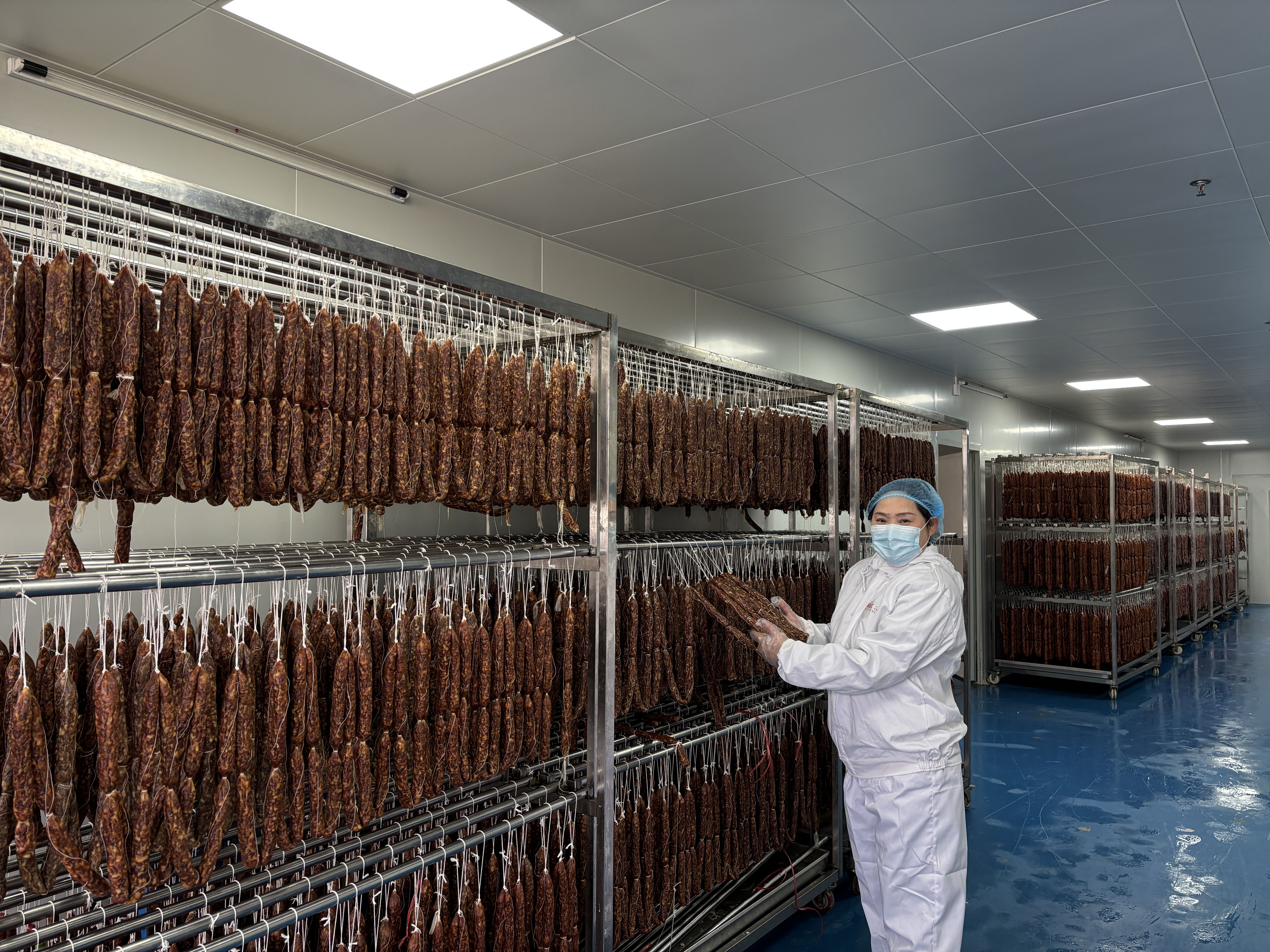 和门店相隔20公里的一产业园内,她新建了一个1000多平方米的香肠加工厂,每天生产的手工香肠有四五吨,线下运往古田、汉阳的3个门店,线上则销往全国。