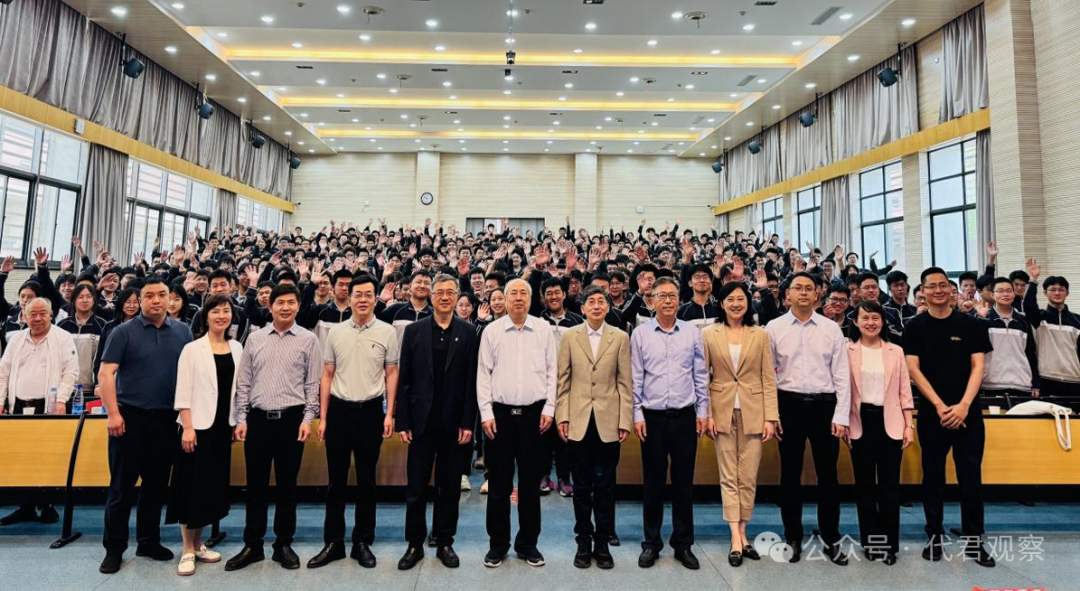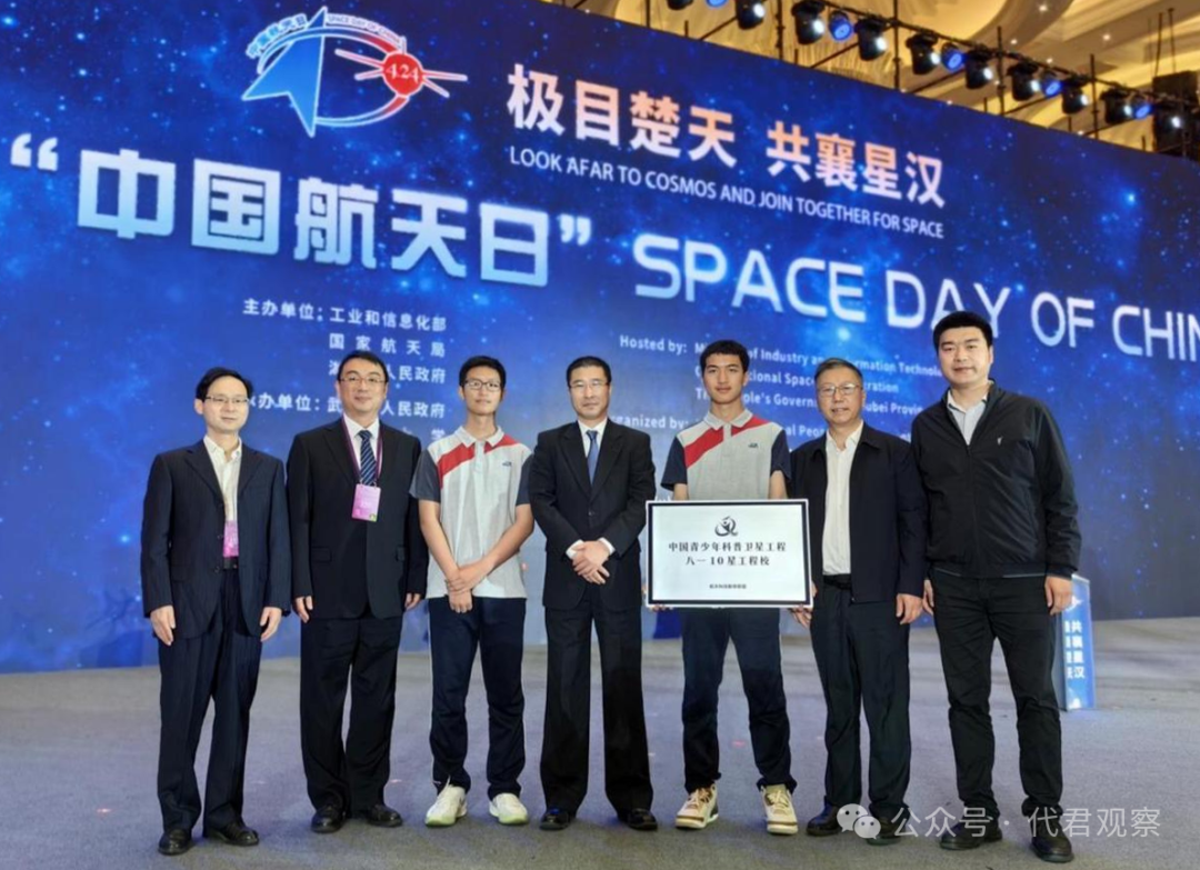 ▲2024年4月24日,华科附中被授予“中国青少年科普卫星工程八一10星工程校”,时任华中科技大学党委书记张广军、副校长高亮与华科附中领导学生在授牌仪式现场合影