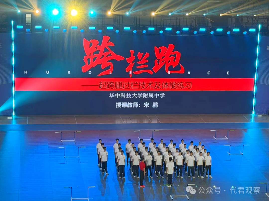 ▲2025年10月18-19日,全国第十届中小学体育与健康课教学展示研讨活动在江苏省无锡市进行,在开幕式的主会场上,仅展示中学、小学各一节课,华科附中体育教师宋鹏执教的高中段《跨栏跑:起跨腿过栏技术及体能练习》进行了现场展示