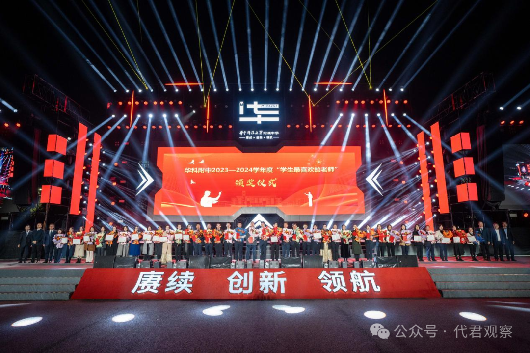▲在建校70周年汇报晚会上,华科附中隆重举行2023-2024学年度“学生最喜欢的老师”颁奖典礼,获奖教师走上前台,收获鲜花、欢呼和掌声