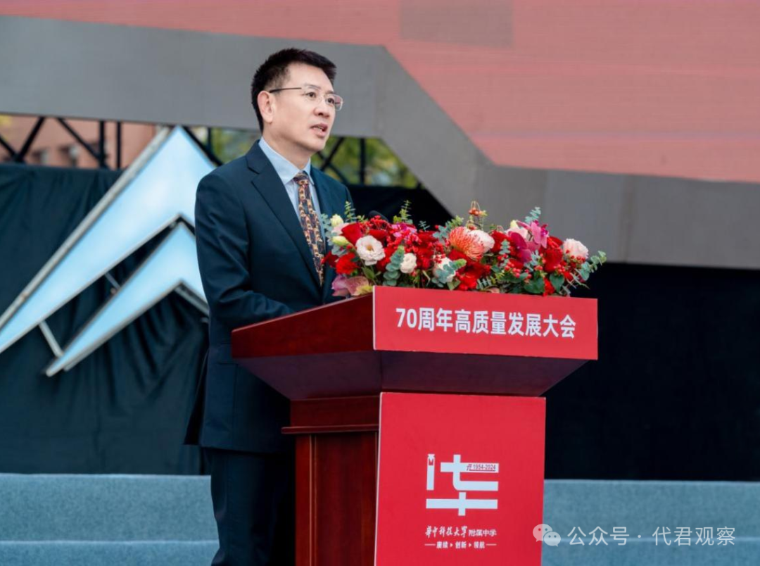 ▲黄立校友在华科附中建校70周年高质量发展大会上发言