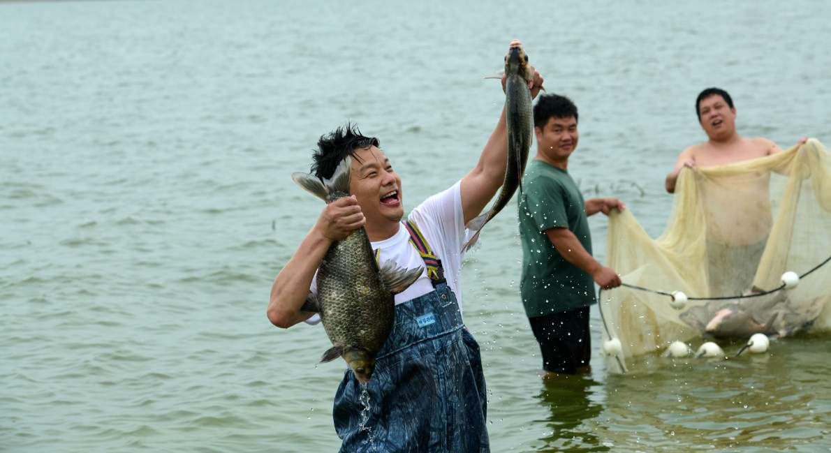 湖北经济学院教授、湖北楚菜研究院院长邹志平在梁子湖捕捞武昌鱼。