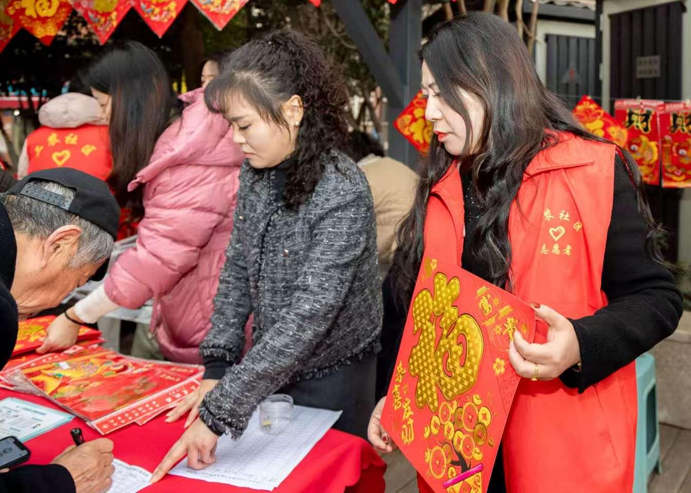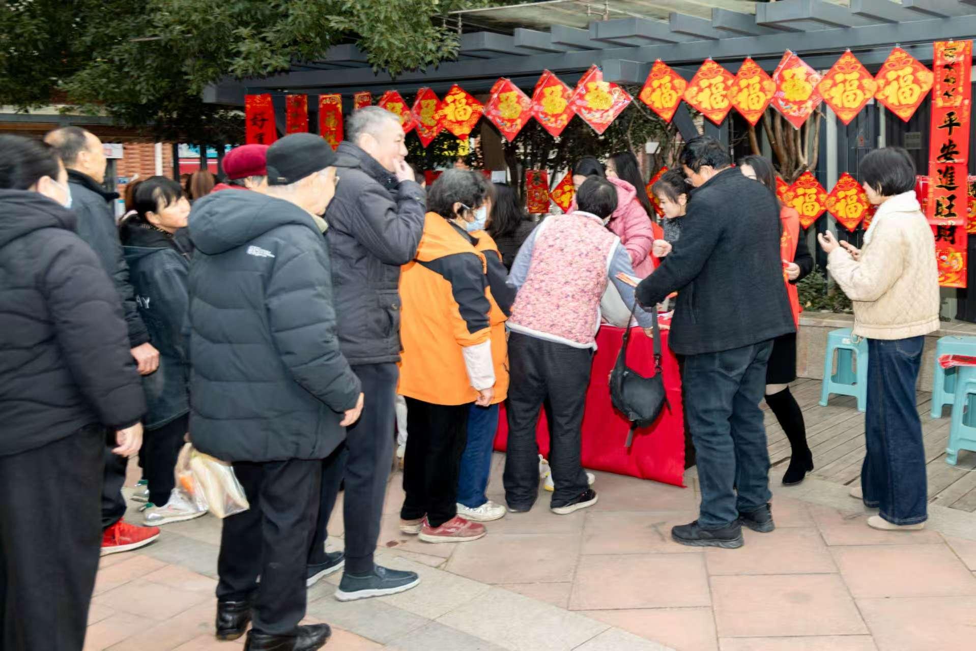 居民们排起整齐的长队,一副副寓意美好的春联、一张张圆润饱满的“福”字铺满桌面,宛如铺开一片喜庆的红色祥云。大家围拢在桌旁,细细品评、认真挑选,笑容在脸上层层漾开。“这张有灵气、有温度,贴在门上,感觉整个家都亮堂了!”手捧春联的张大爷满心欢喜地感慨。这份承载着社区情谊的“文化年货”,连同工作人员特意上门赠送给高龄老人与特殊家庭的“福”字,穿越楼栋街巷,温暖了无数心房。