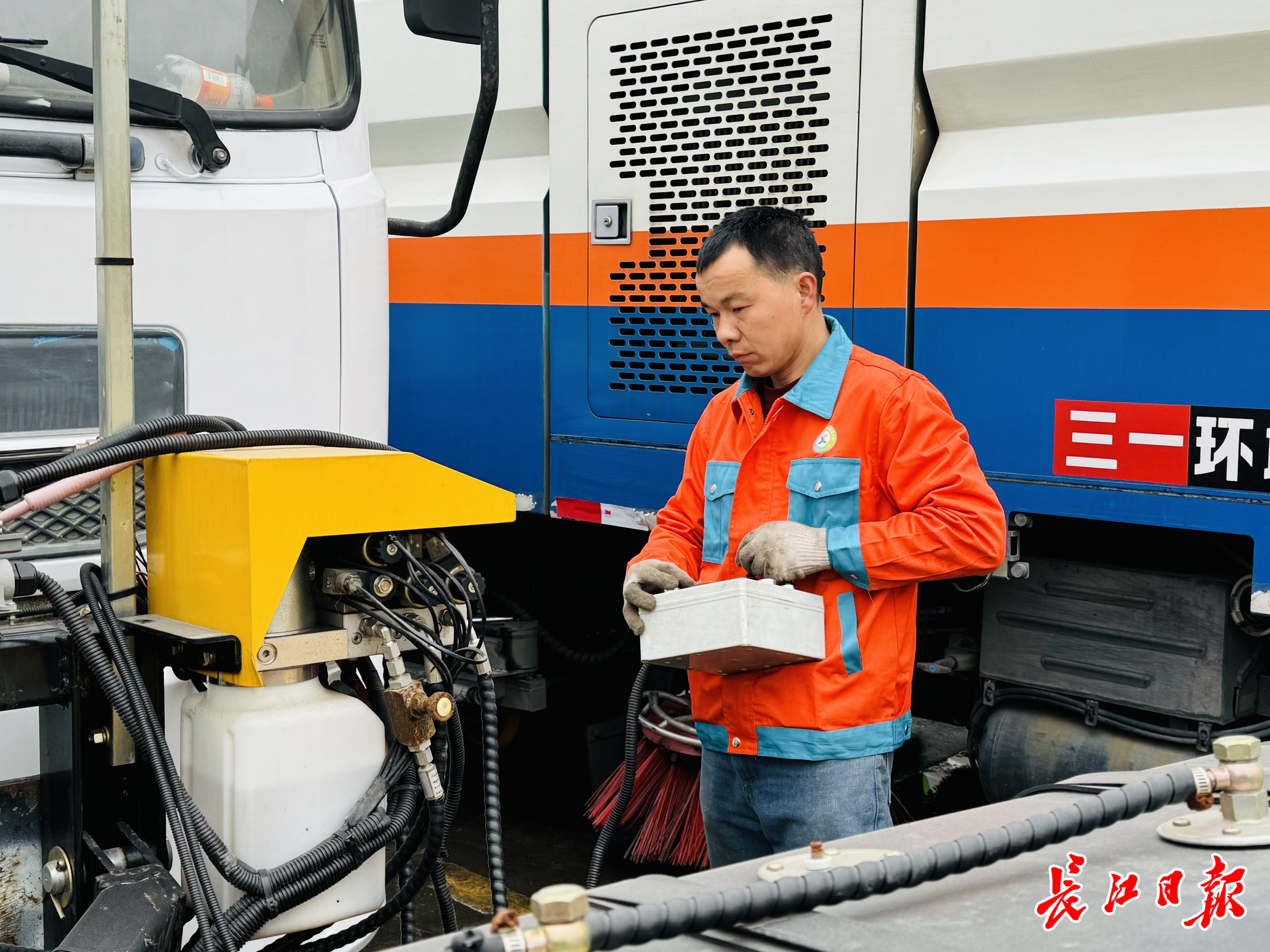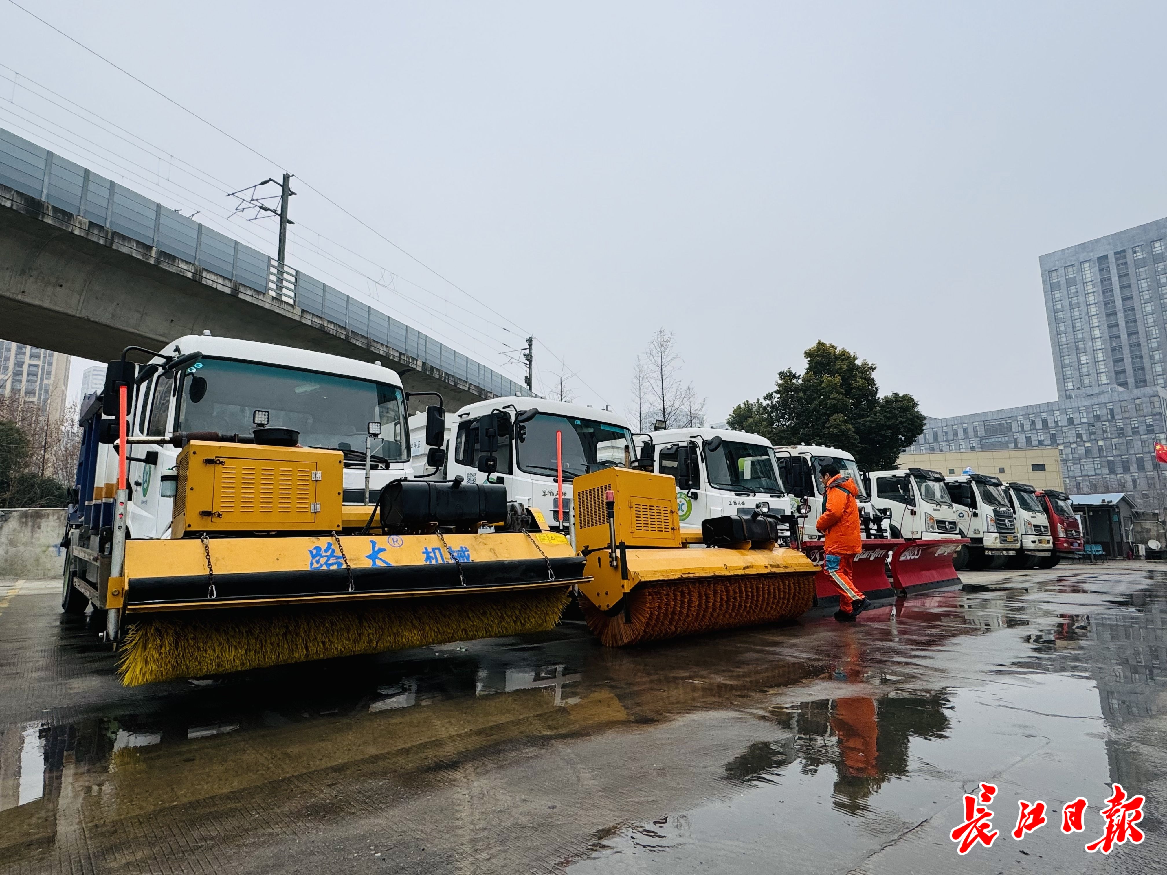 当日上午9时许,在江岸区石桥一路环卫车辆停保场,寒风凛冽中,数十辆大型洒水车、机扫车整齐排列。技术人员正在为车辆安装雪铲和滚雪刷,“注意调整角度,确保雪铲与车身保持水平!” 操作工陈勇手持控制器,一边调试一边提醒环卫司机注意事项。