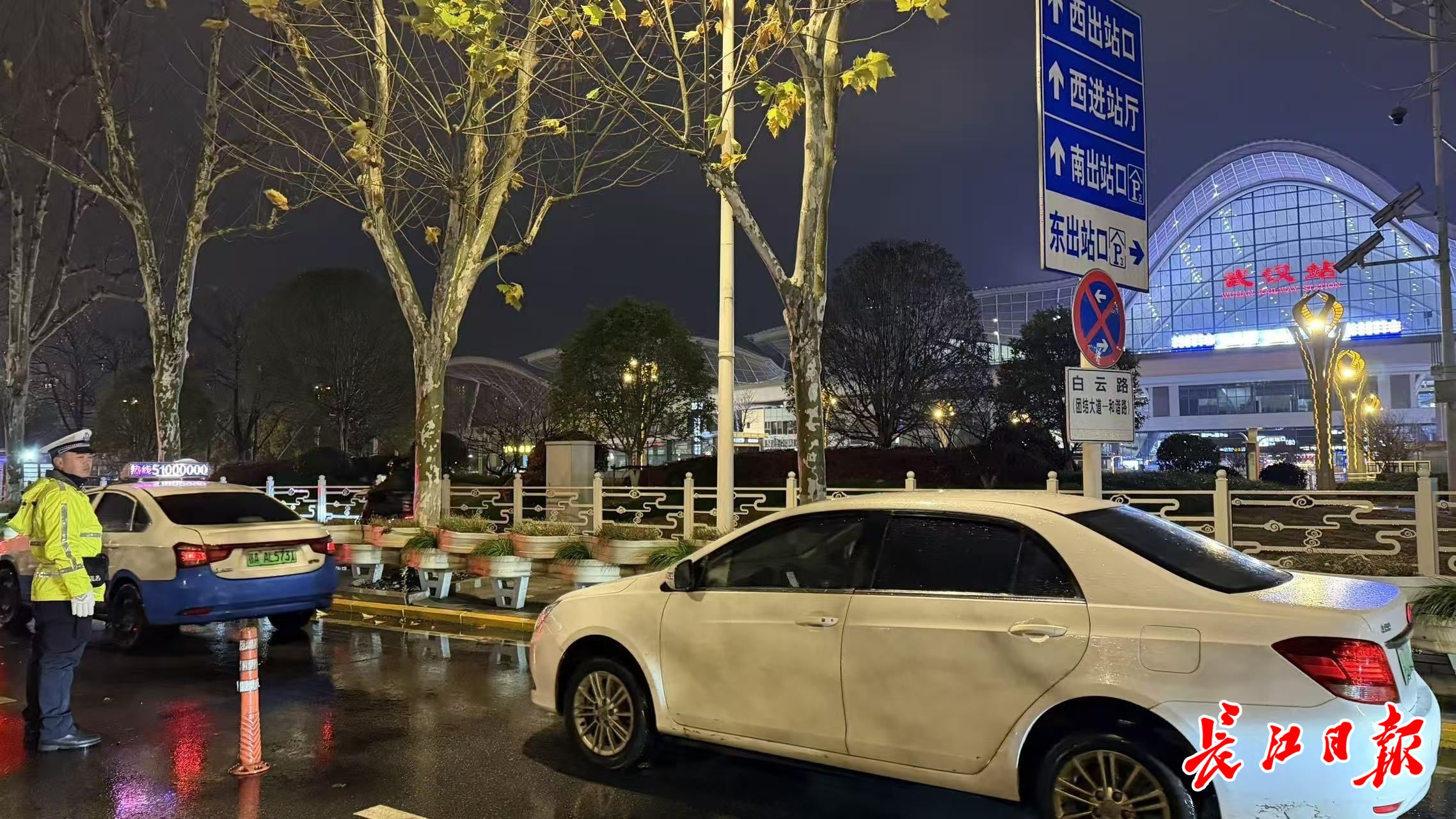 洪山交警程考19日晚在武汉站外维护秩序。 记者夏奕 摄