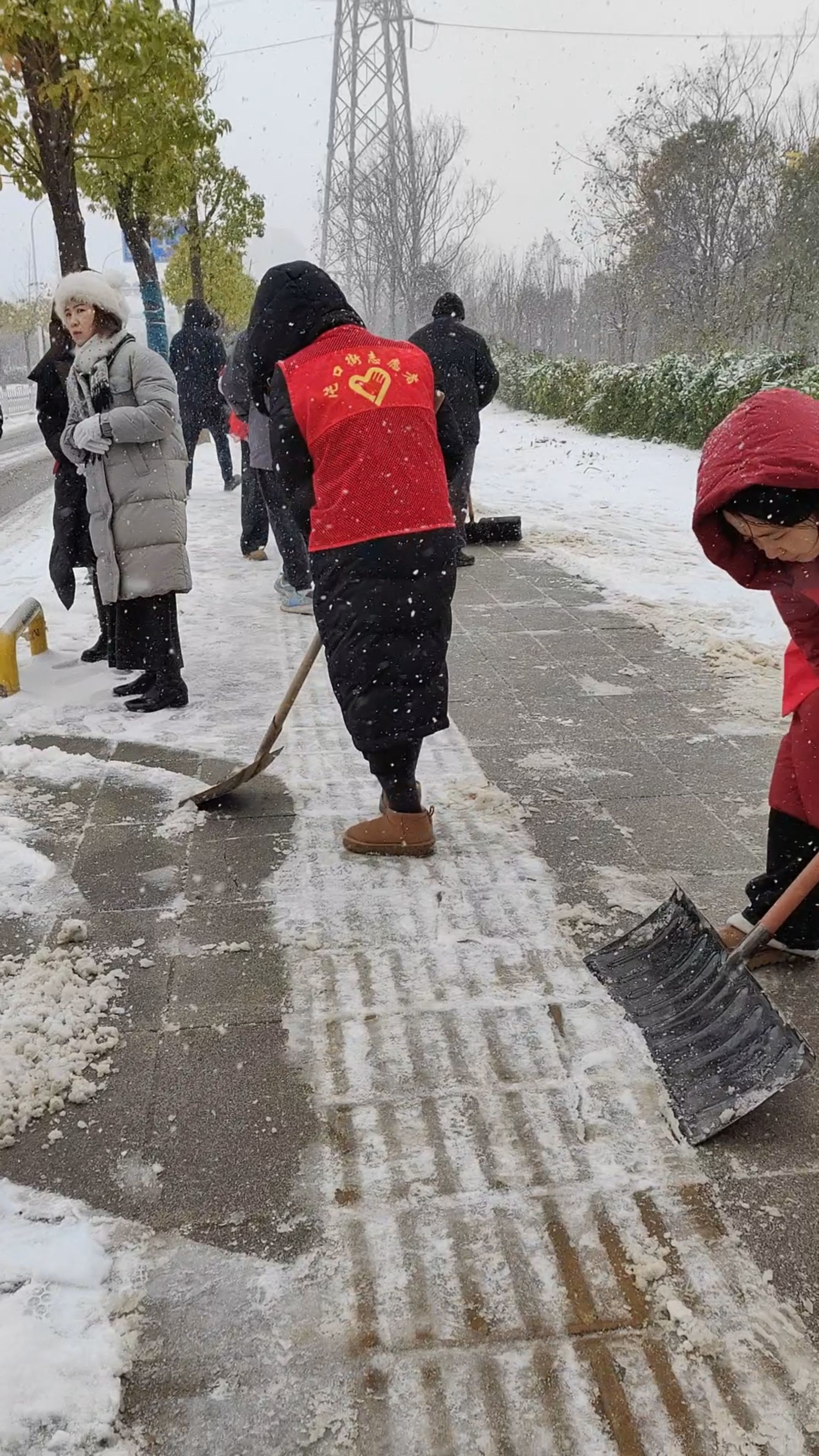 带孙子散步的张奶奶接过热饮说:“你们辛苦了。”小区便利店老板送来防滑毯,家住2栋的小朋友乐乐也拿着自己的小铲子帮忙扫雪。