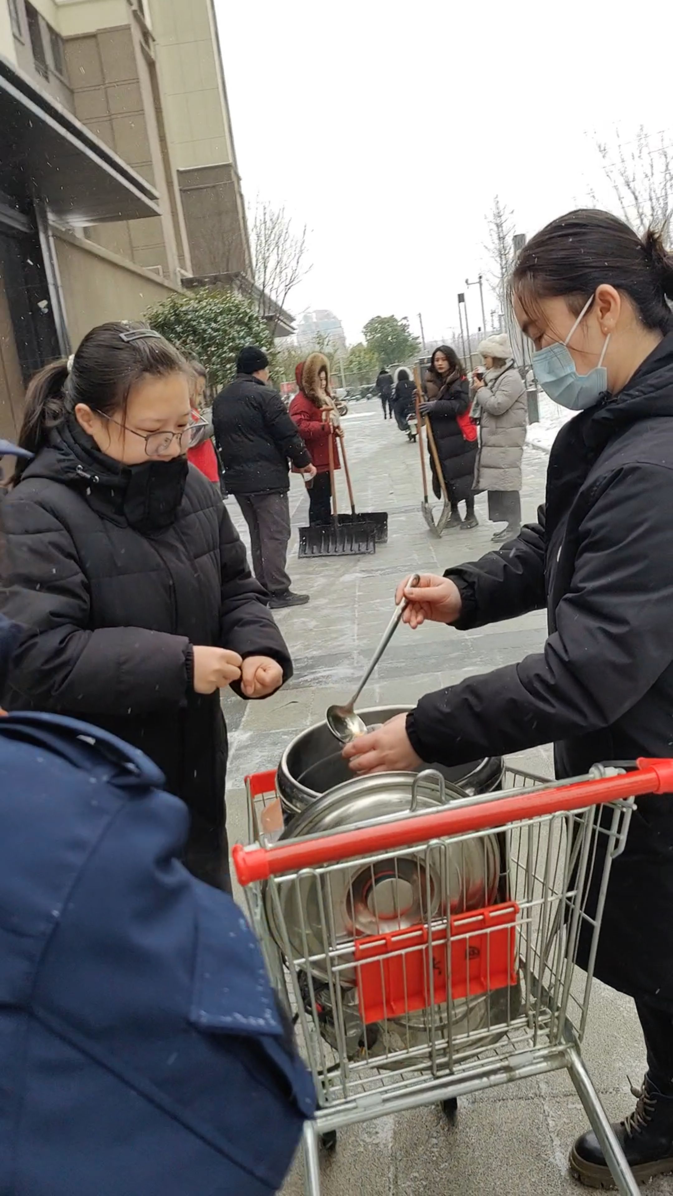雪还在下,落在大家身上。干了没多久,手套就湿了,手也冻得发红。物业工作人员推着小车送来刚煮好的姜丝可乐,让大家轮流喝点热的暖暖身子。路过的居民也能领一杯。