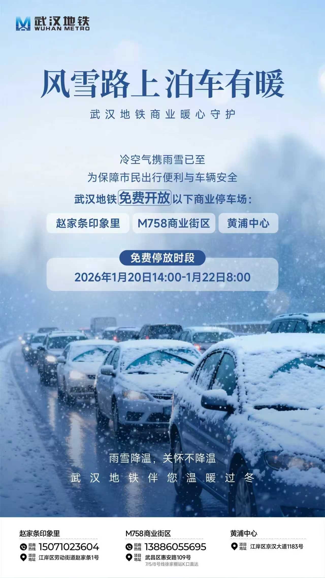 长江日报大武汉客户端1月20日讯(记者陶常宁 通讯员刘丹丹)1月20日,长江日报记者从武汉地铁集团获悉,为应对此轮低温雨雪冰冻天气,保障市民出行便利与车辆安全,武汉地铁推出“风雪路上 泊车有暖”暖心服务:于1月20日14:00至1月22日8:00免费开放赵家条印象里、M758商业街区、黄浦中心三处商业停车场,以行动传递“雨雪降温,关怀不降温”的城市温度。