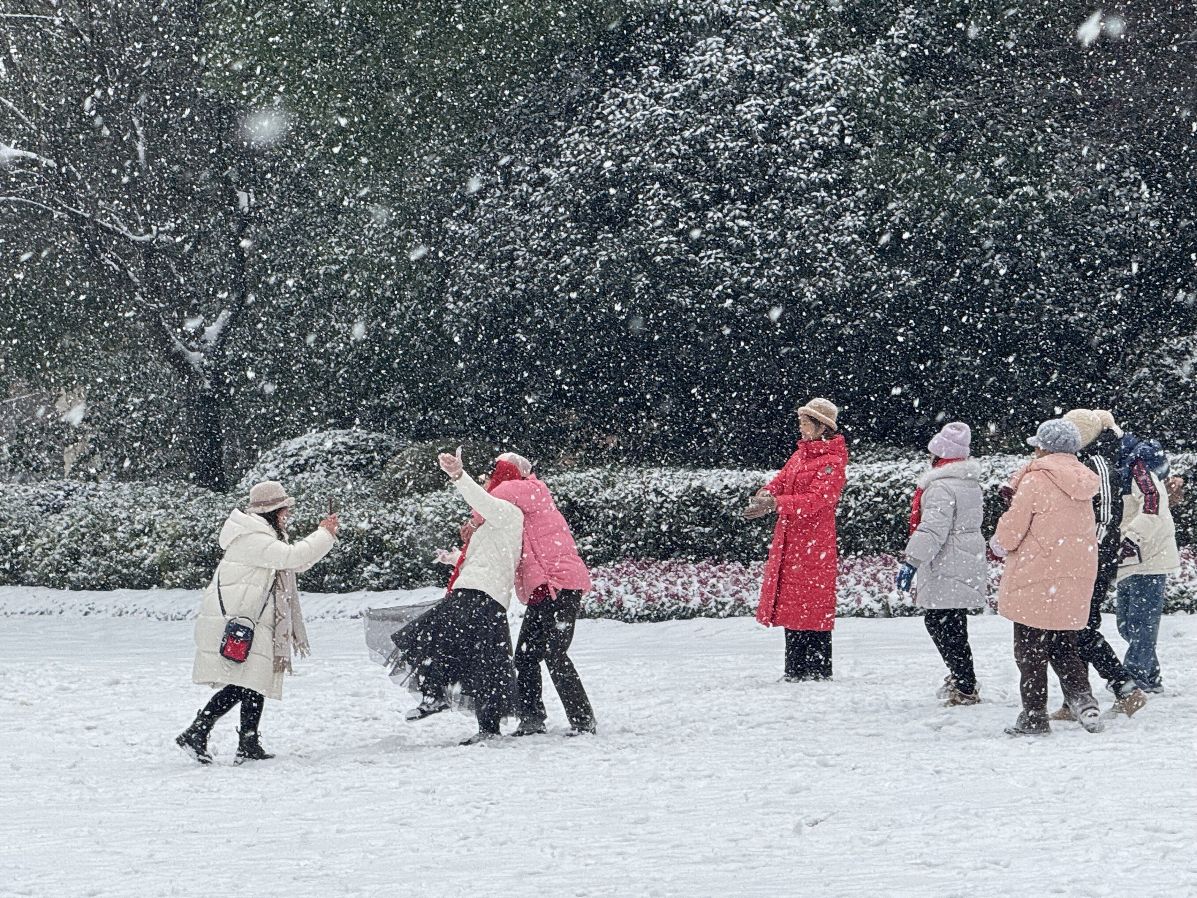 作为全国四大梅园之一,东湖梅园三面临水,梅花品种丰富,是赏梅踏雪的绝佳去处。雪后园区内,冷艳亭、花溪等景点银装素裹,“雪海宫粉”远观似雪、花香馥郁,“龙游梅”曲枝缀雪、姿态奇特,“美人梅”紫红花瓣映雪更显艳丽,完美诠释“梅须逊雪三分白,雪却输梅一段香”的意境。