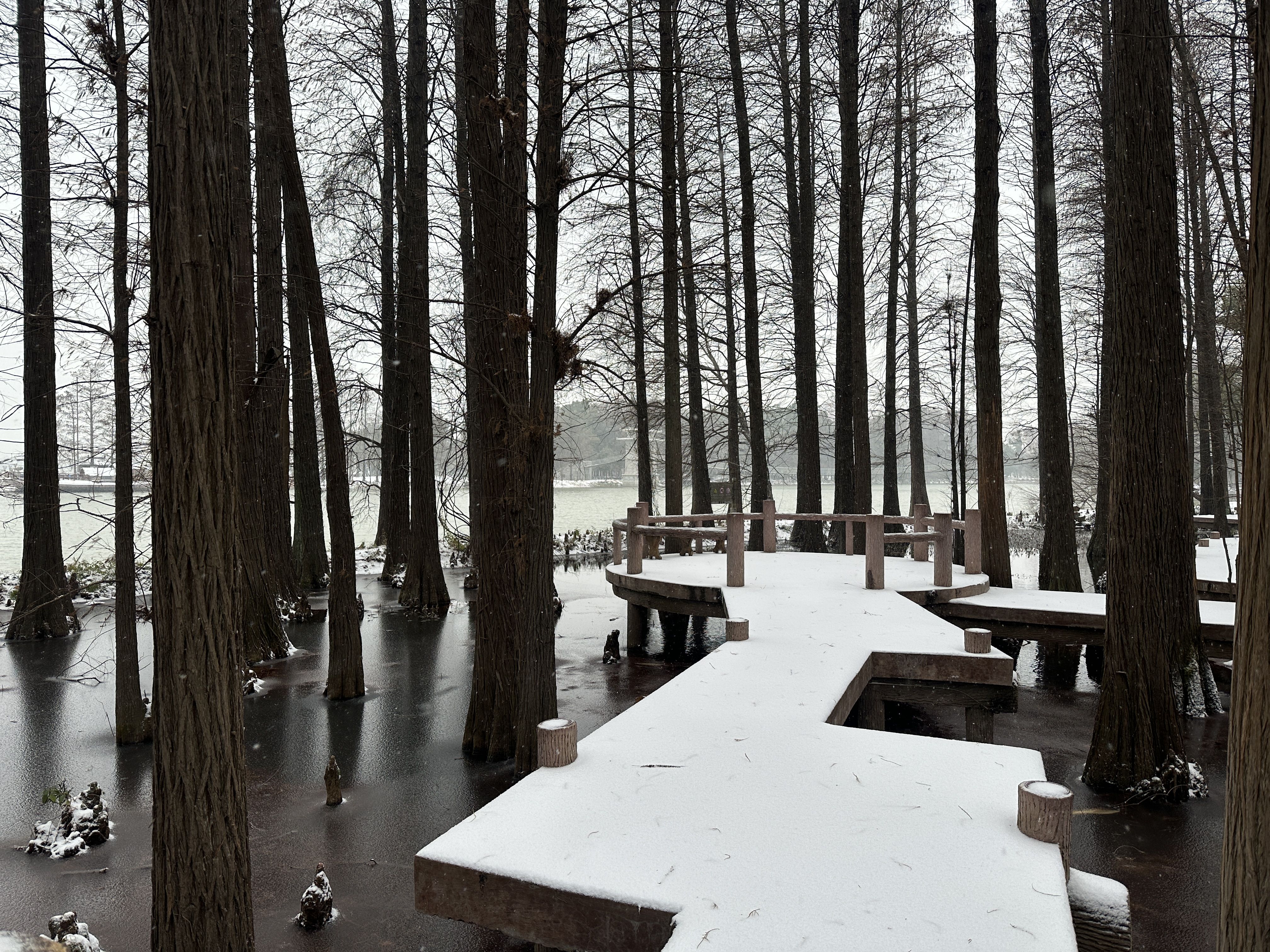 落雁景区的九曲桥是热门打卡地,木质廊桥穿梭在池杉林中,雪后桥面覆白,与岸边红褐相间的池杉、气生根景观构成独特画面。人行桥上恍若置身仙境,与旁边的雁栖亭相映成景。