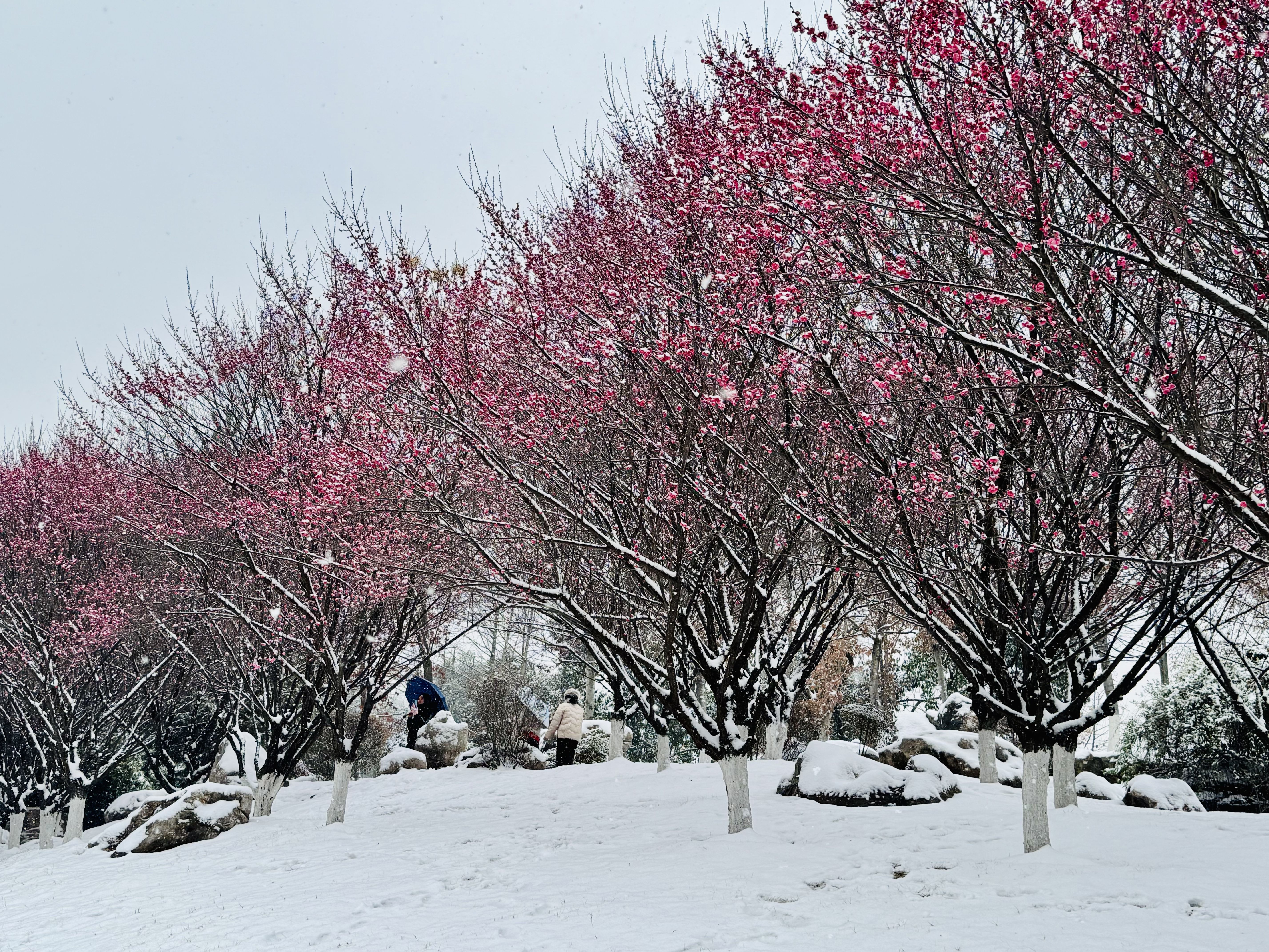 马鞍山森林公园的梅山是冬日赏雪佳处,占地40余亩的山坡上,1300余株梅花沿起伏地形分布,涵盖江梅、粉皮宫粉、变绿萼等20多个品种。雪后梅枝被白雪覆盖,低枝的梅朵簇拥在身旁,红、粉、白三色花瓣与积雪相映,形成层次丰富的雪景画卷。