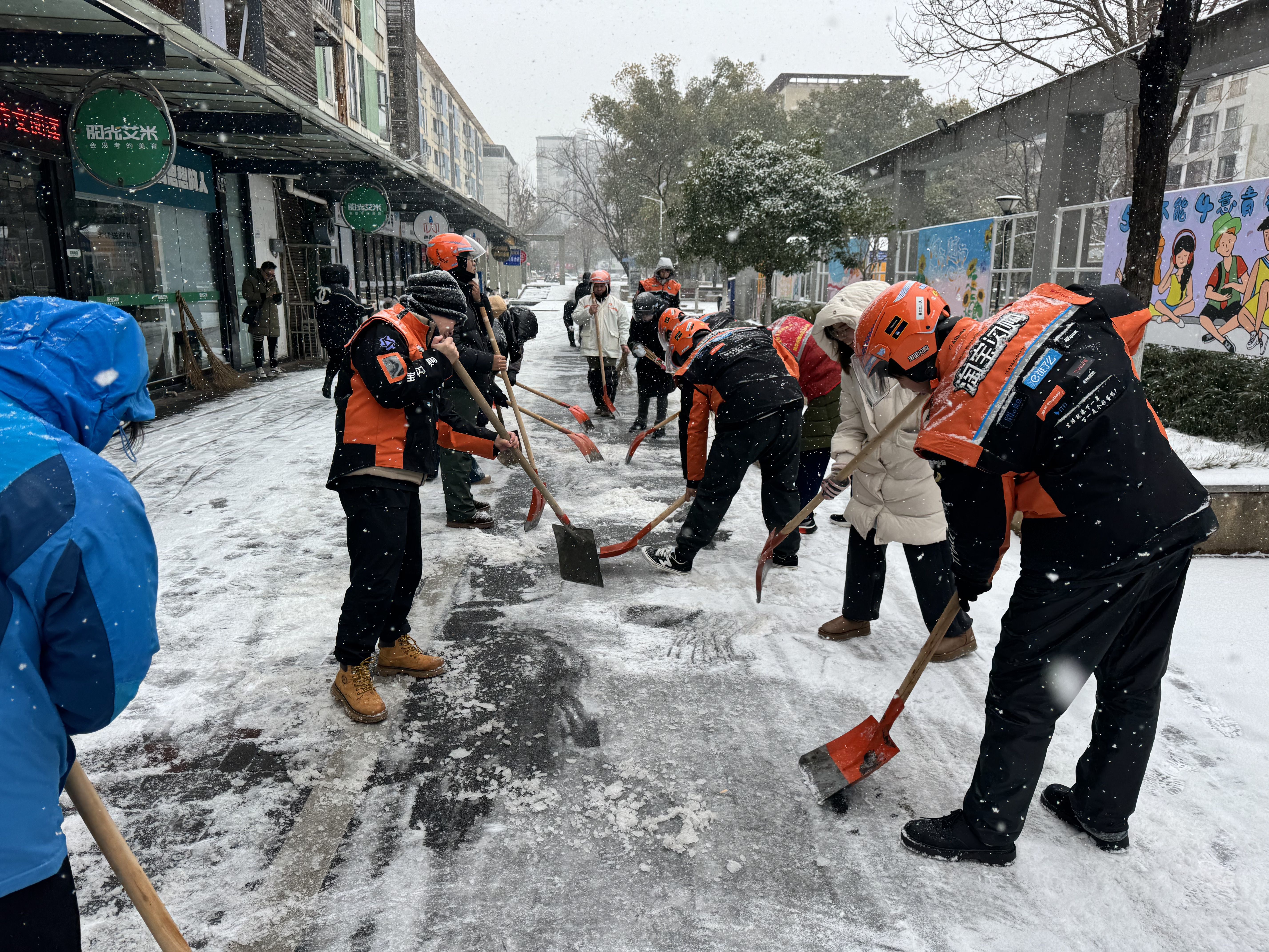 “这会儿订单不多,先把驿站门口的雪清干净,方便大家进出。”站长宋成放下手机,在群里一招呼,近40名骑手陆续赶来。雪粒簌簌飘落,宋成接过手套挥起铁锹铲向积雪,很快铲出一条黑色路面。骑手张劲紧跟其后,用扫帚清理残雪。