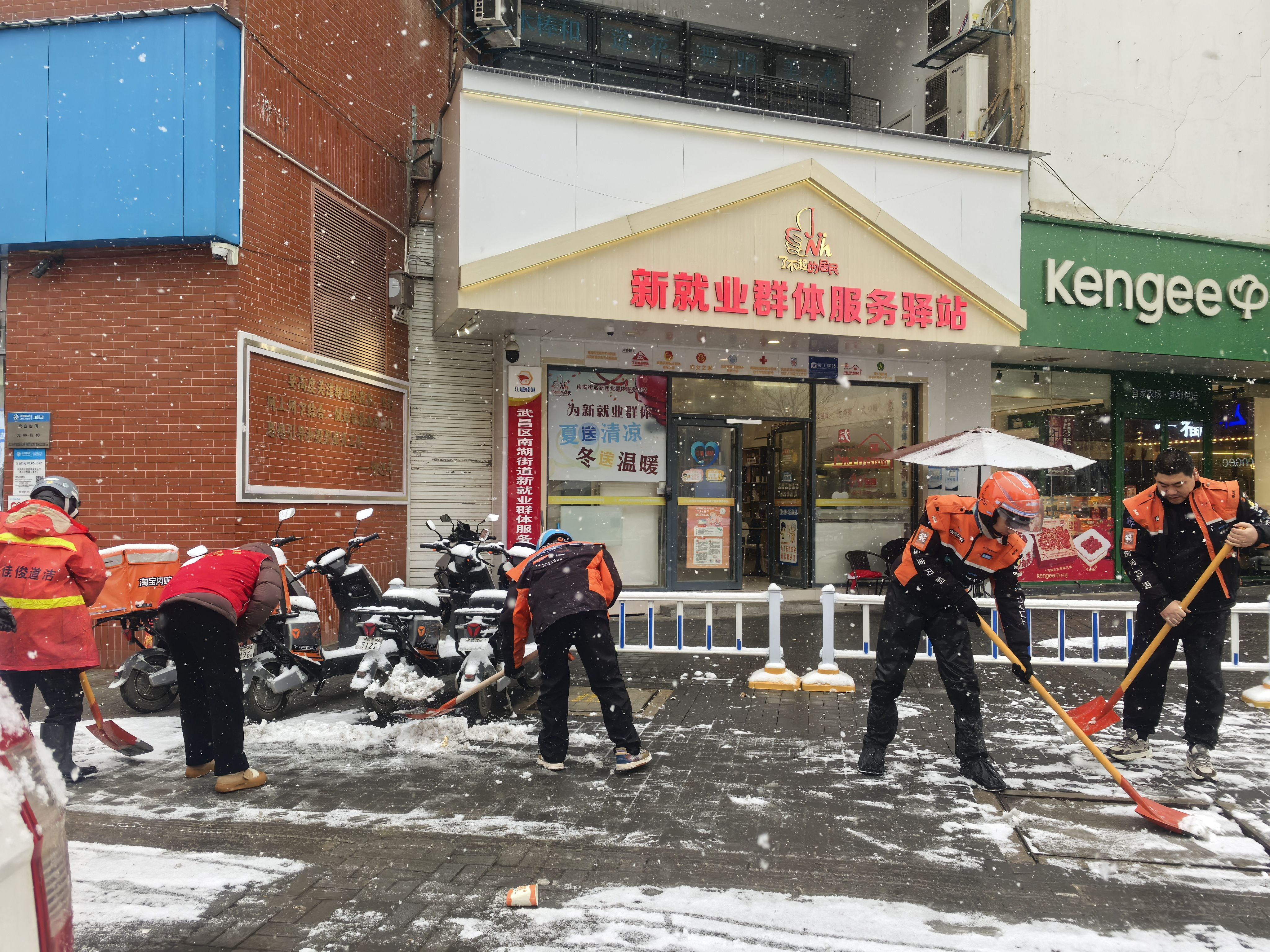 武昌区南湖街道新就业群体服务驿站前,外卖骑手帮助社区扫雪。