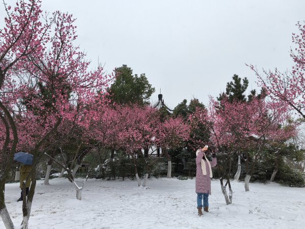 龟山公园蜿蜒的山路旁,雪白梅红,市民纷纷驻足观赏。